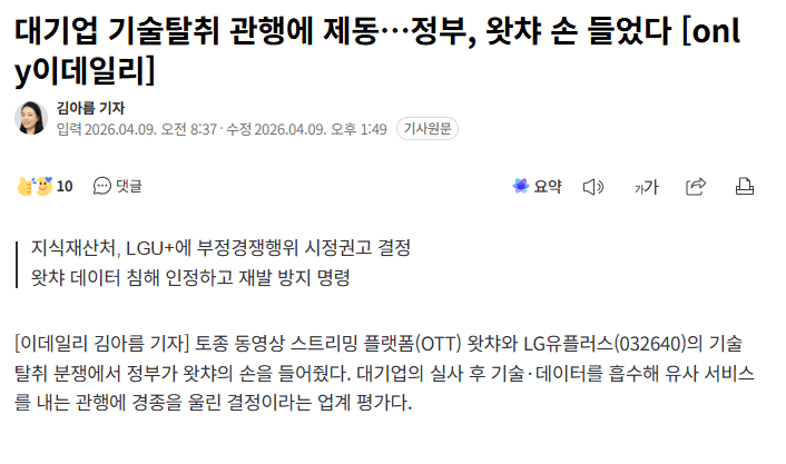 LG U+가 투자 심사를 진행하면서 왓챠의 운영 정보와 데이터를 제공받았다. 그러나 투자 결정은 무산되었다. 하지만 LG U+는 받아본 정보를 활용해 자신의 플랫폼을 만들었다고 드러났다.법원은 이를 데이터 침해로 인정했고, 왓챠의 손을 들어줬다. 국내 처음으로 명확한 데이터 침해 판례가 나온 것이다.그런데 LG U+는 이미 판결 직전에 모바일TV 서비스 종료 계획을 공지했다. 수익성 부진이 이유라고 했다.