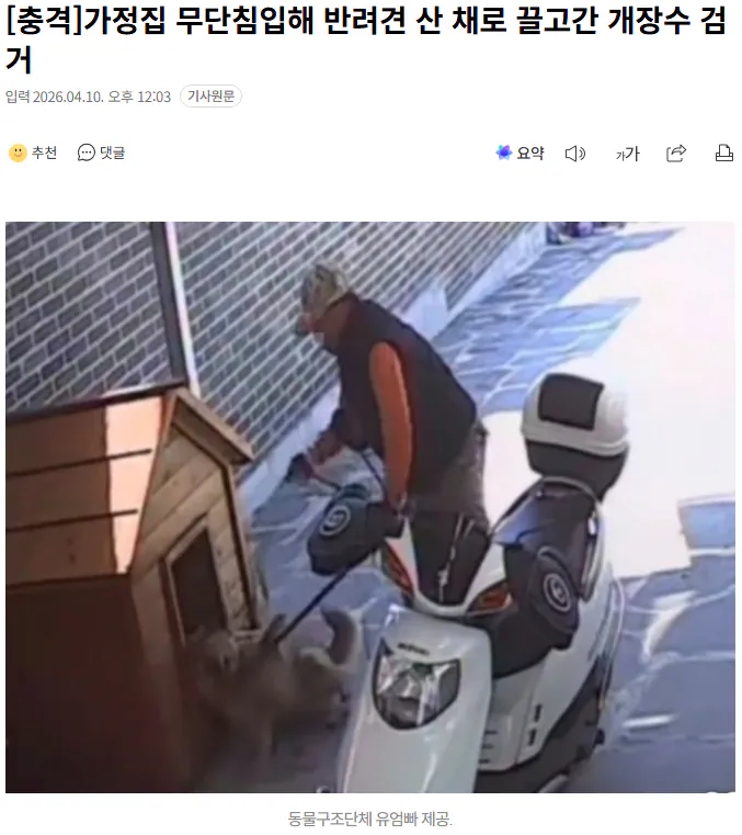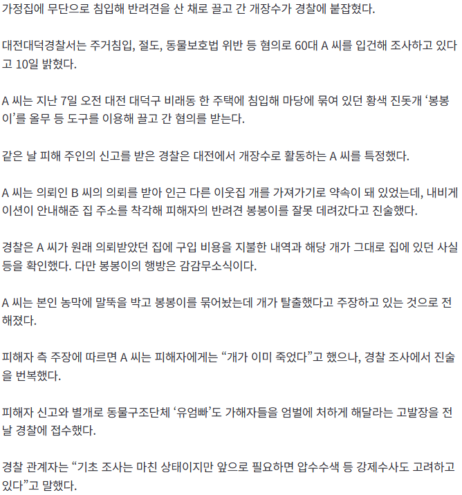 타인의 주택에 무단으로 들어가 반려견을 강제로 데려가려던 개 도살업자가 경찰에 검거됐다.해당 개장수는 현재 경찰의 조사를 받고 있으며, 불법 침입 및 강탈 혐의로 진행 중이다.
