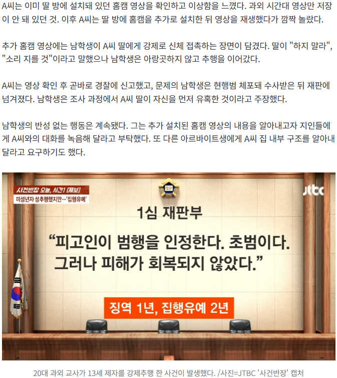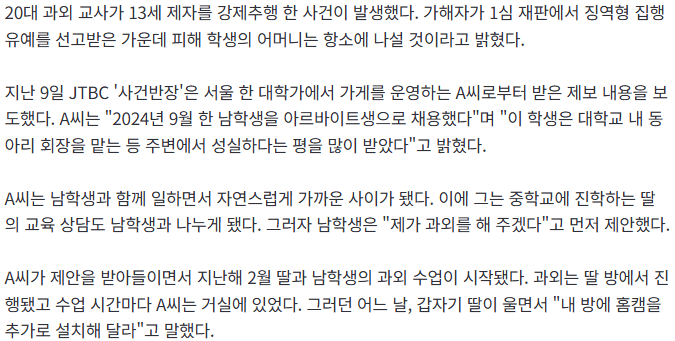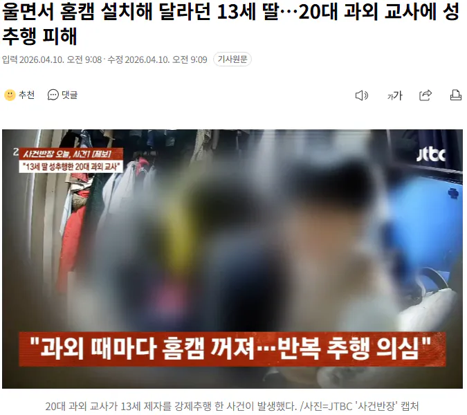 20대 과외 교사가 13살 학생에게 성추행을 저질렀다는 신고가 접수됐다. 피해자는 울면서 홈 카메라 설치를 강요당했던 것으로 드러났다. 현재 경찰에서 사건을 수사 중인 상황이다.