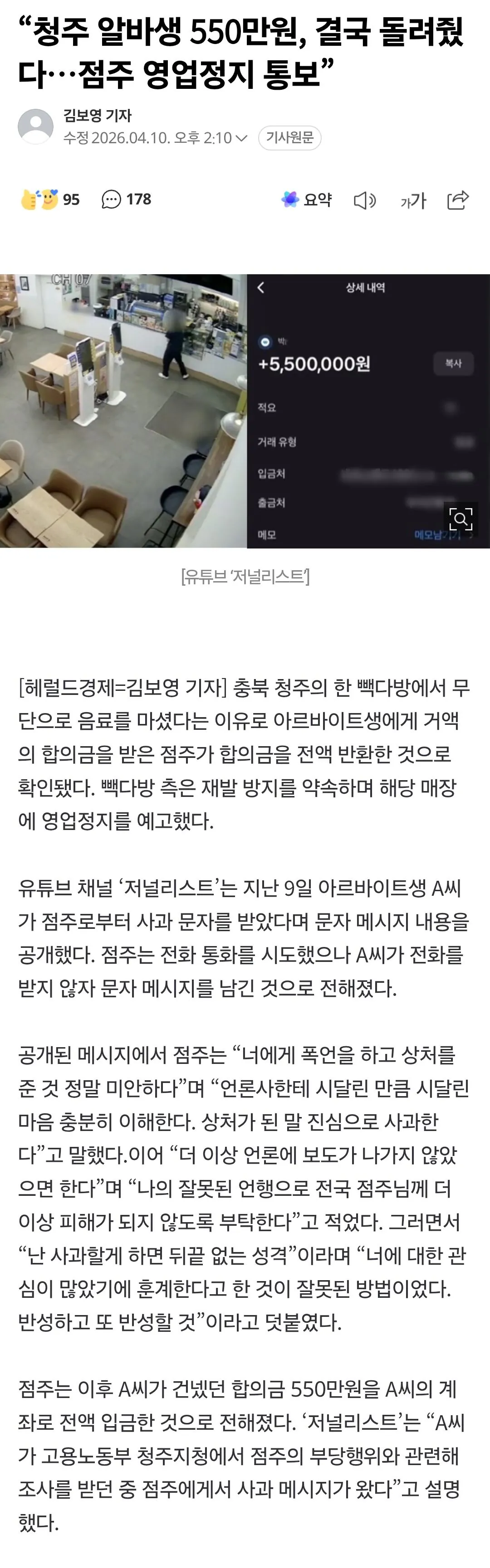 “청주 알바생 550만원, 결국 돌려줬다…점주 영업정지 통보”