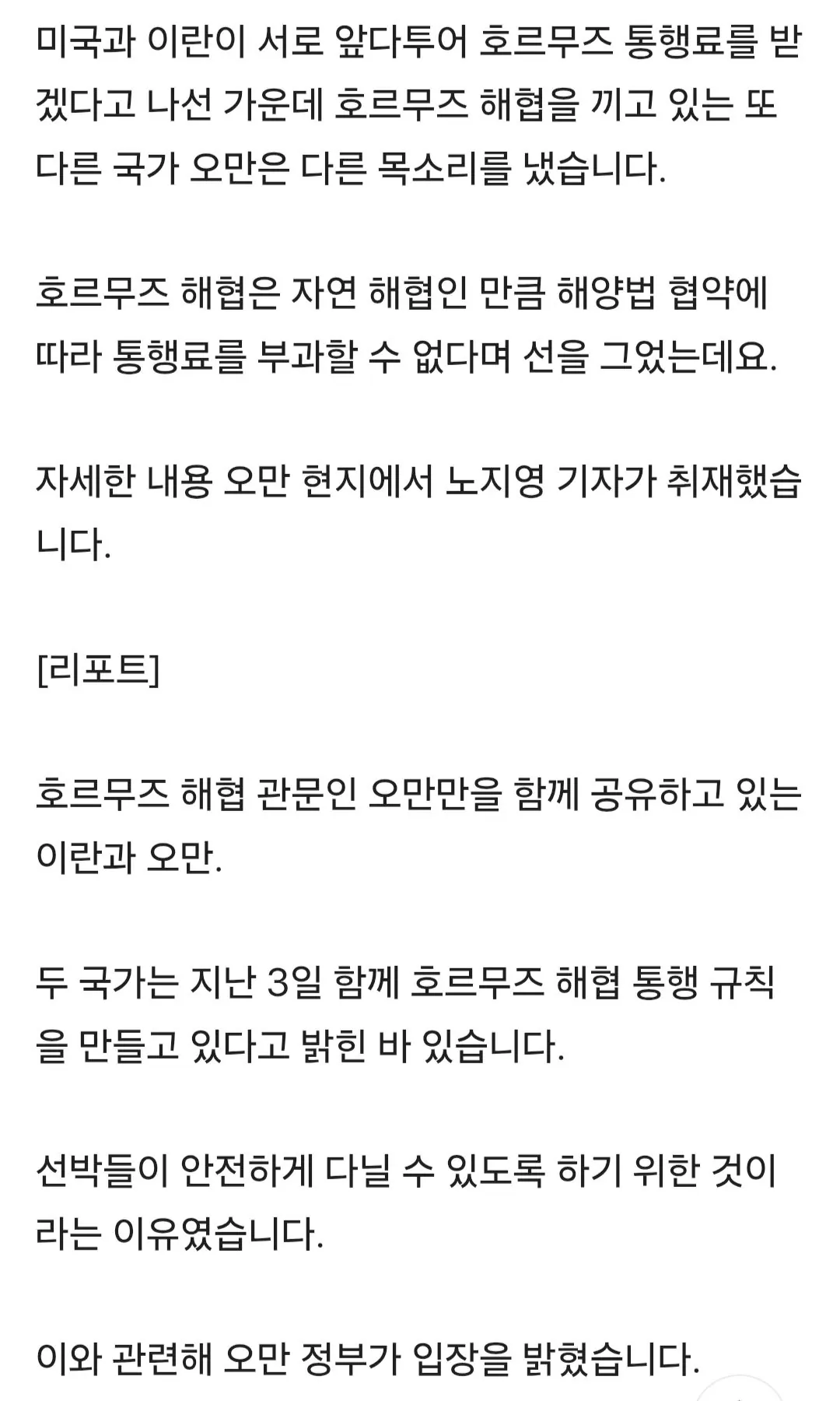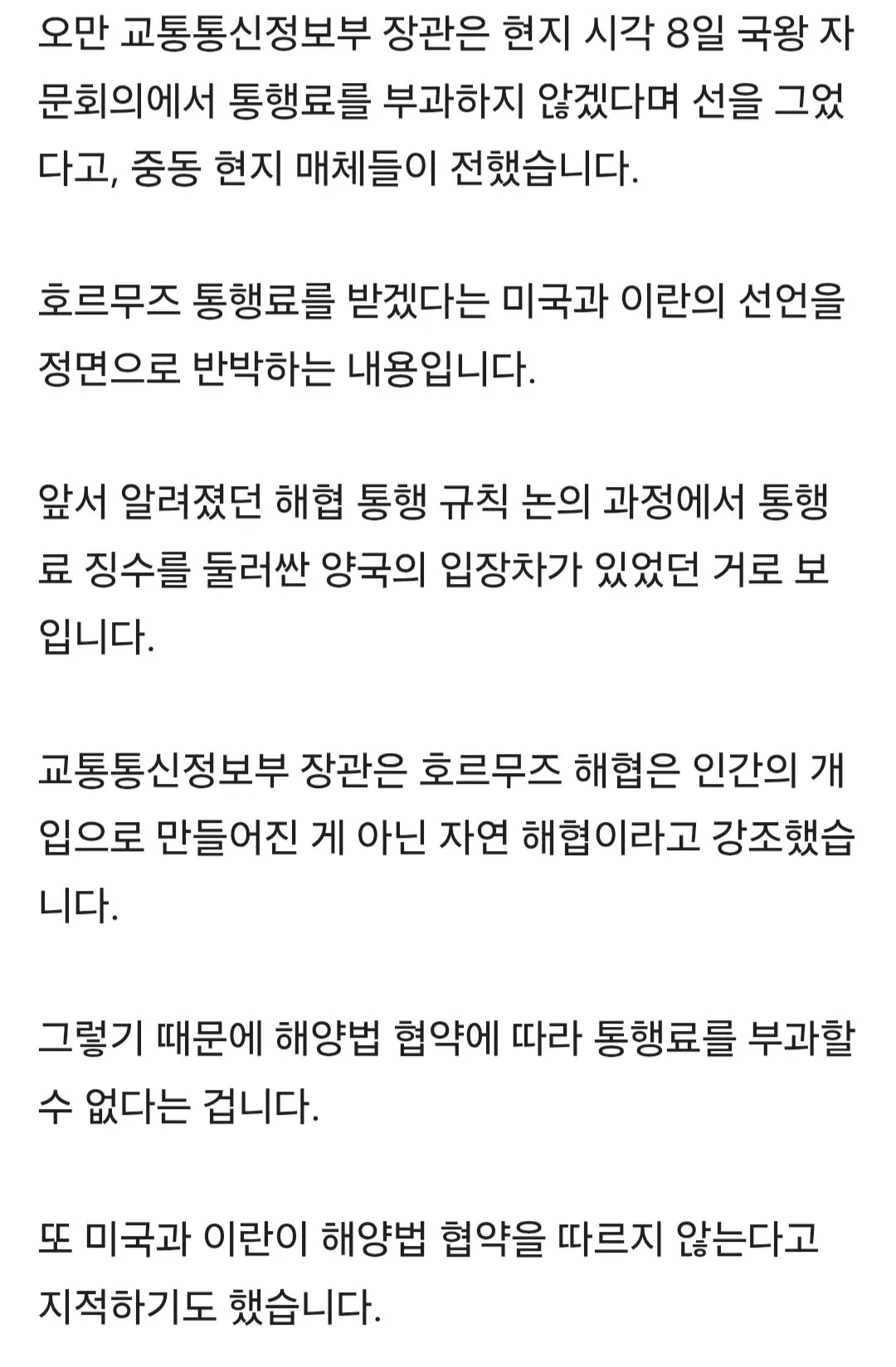 호르무즈 해협 통행료 못챙기는 오만의 강수