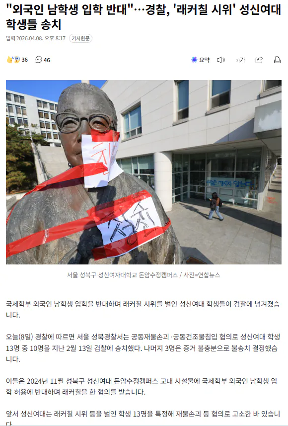 성신여대는 애초에 공학 전환 계획도 없었는데 외국인 유학생 받는게 싫다고 동덕여대가 멋져보이니 락카 뿌린겁니다. 참고로 이화여대에도 남학생 유학생을 받습니다. 여성 리더 키우라고 만든 여대인데 여성 리더는 1명도 안나오는데 존재 이유가 없습니다.