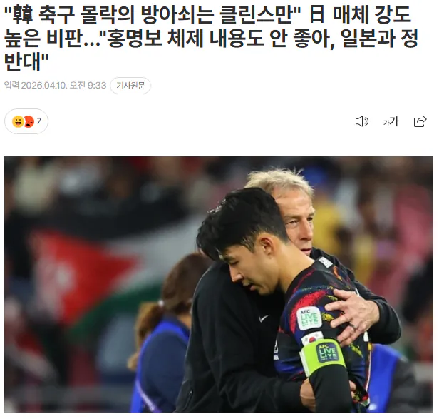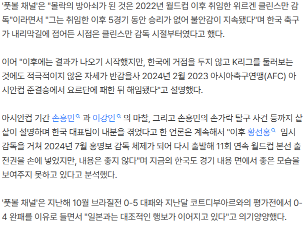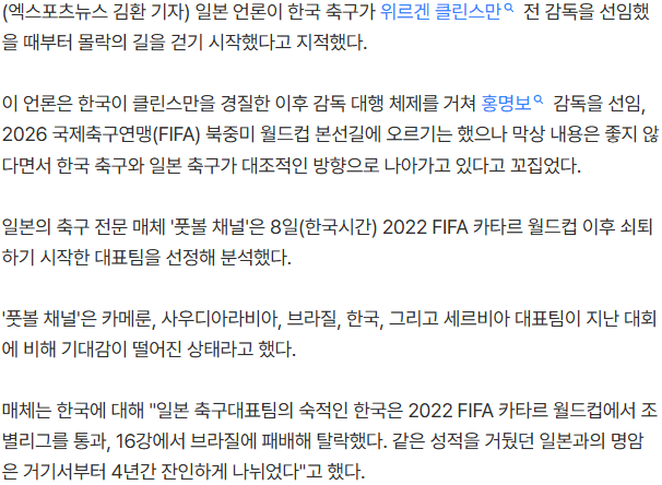 일본 매체들이 한국 축구의 위기를 클린스만 감독의 책임이라고 강하게 지적했습니다. 홍명보 체제 역시 내용이 부실했다는 평가와 함께, 체계적인 일본 축구와는 완전히 반대 방향으로 가고 있다며 질타하고 있네요.