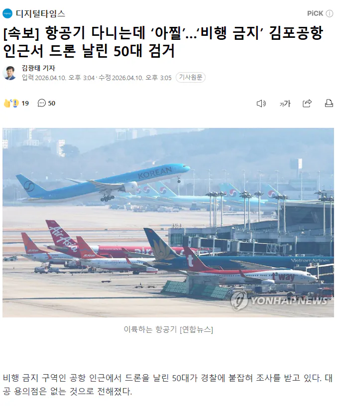 항공기 다니는데 ‘아찔’…‘비행 금지’ 김포공항 인근서 드론 날린 50대 검거