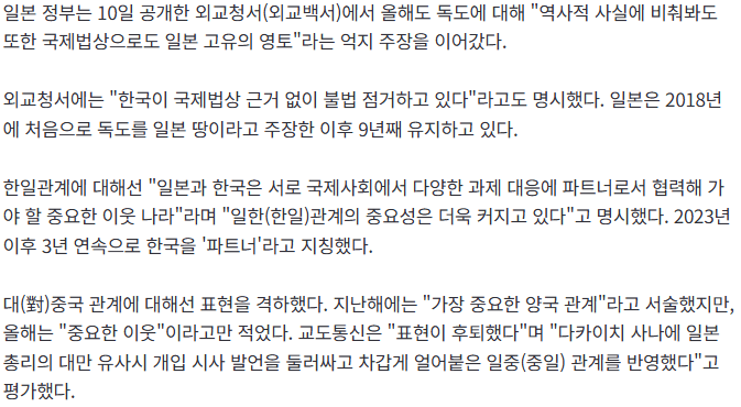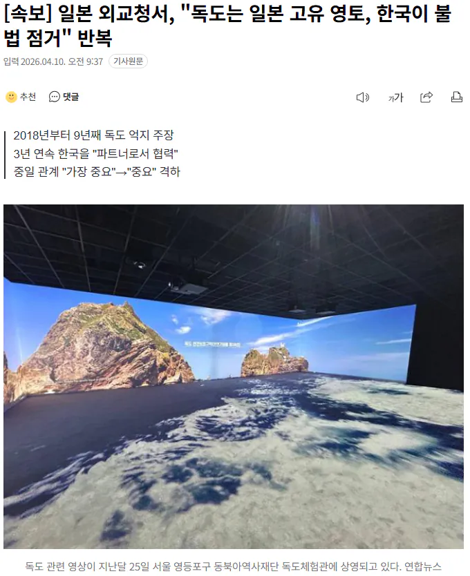 일본이 내놓은 외교청서에서 또다시 독도를 자신들의 고유 영토라고 명시했다고 한다. 여기에 한국이 불법으로 점거하고 있다는 표현도 함께 담겼다고 하는군. 해마다 되풀이되는 주장이지만 이번에도 동일한 입장을 고수한 것으로 보인다.
