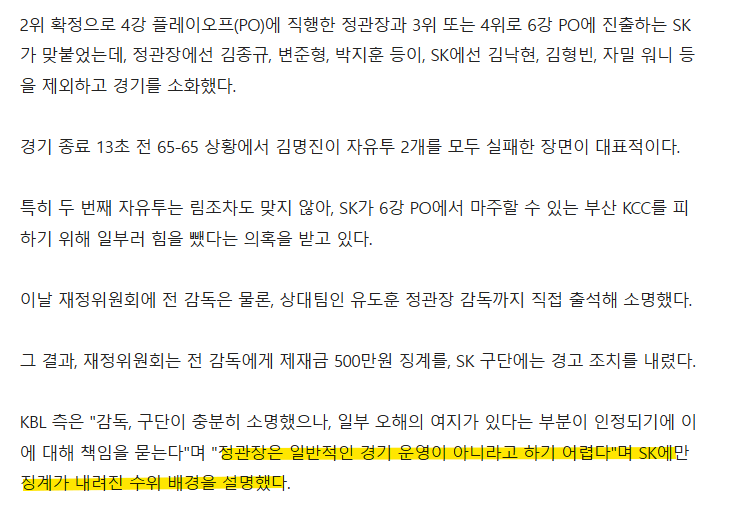 경기 내내 두 팀이 경기를 포기하려는 듯 보임. 처음 턴오버 선수가 볼을 잡으려고도 하지 않고, 샷클락 17초 남은 상황에서 엉뚱한 파울이 나와 자유투까지 헌납됨.SK는 불성실한 경기로 500만원 벌금을 받았지만 상대팀은 아무 징계가 없어 논란이 더 커지는 중.