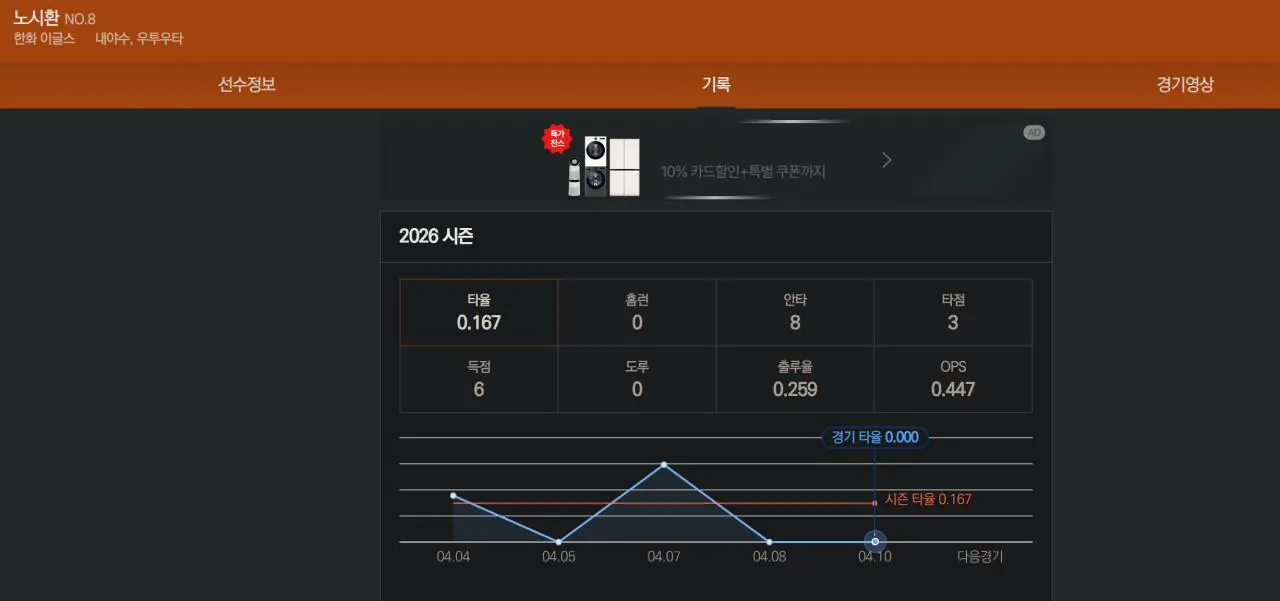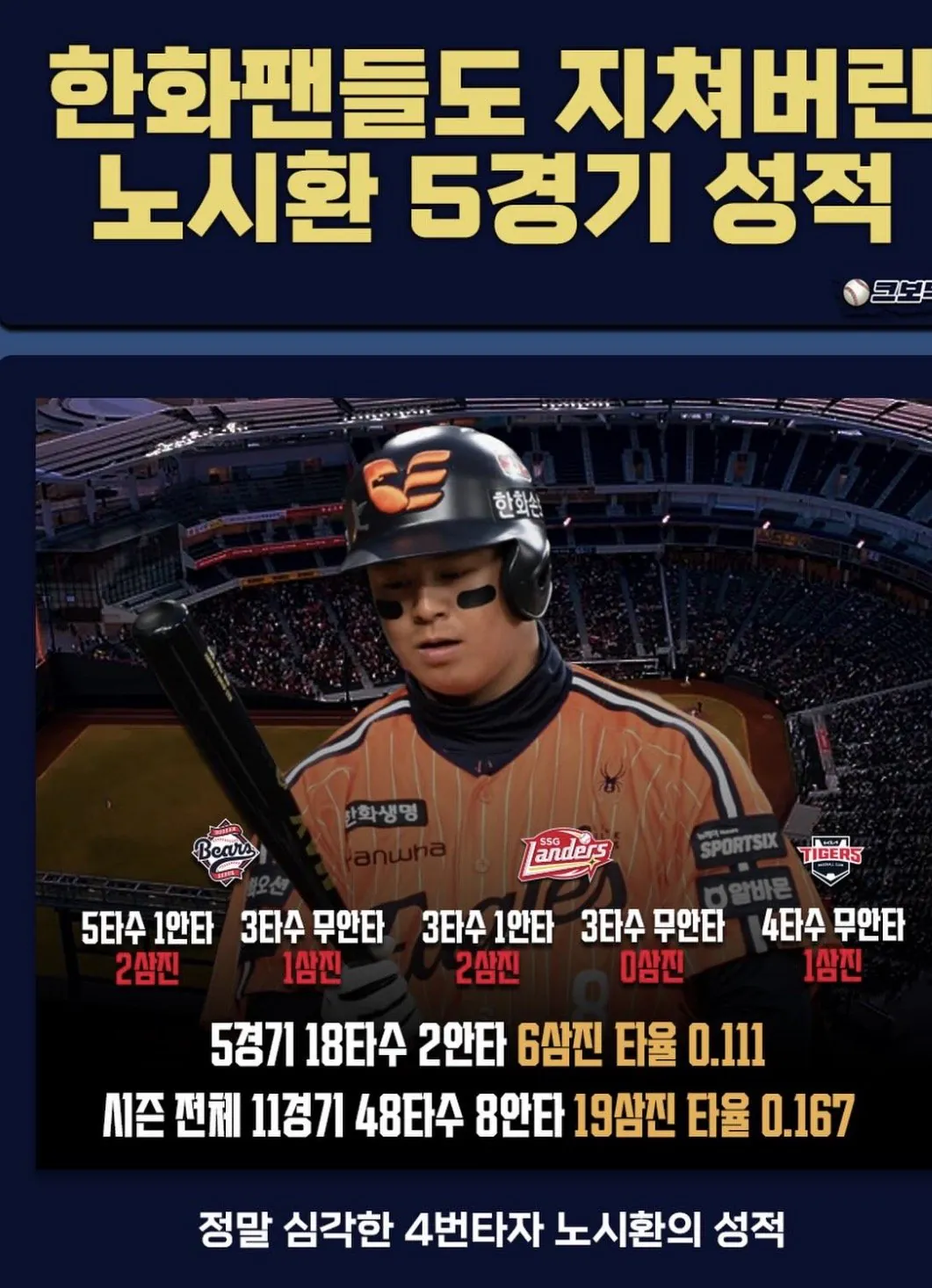 한화의 노시환이 11년 307억이라는 어마어마한 금액으로 비FA 계약했다.올 시즌 성적이 정말 답답하다고 팬들이 말한다.어제도 경기 내내 형편없었고, 팀 패배에 일조했다.더 웃기는 건 이렇게 망해도 감독이 계속 4번 타자로만 쓴다는 거다.오늘도 4번으로 기용할 거라고.