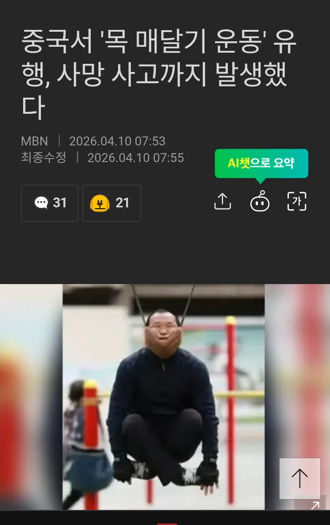 중장년층을 중심으로 시작된 이 운동이 지난해부터 온라인을 타면서 급속도로 번지고 있습니다. 최근에는 20대 청년들도 SNS에 인증하며 따라하고 있으며, 도시공원에서는 로프에 매달려 진자처럼 몸을 흔드는 사람들을 흔하게 볼 수 있게 됐다고 하네요.