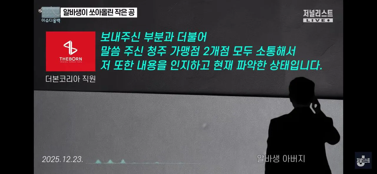 유튜버 이슈디올백은 "아버지가 그때 상황을 방치하면 큰 문제가 될 거라고 본사에 경고했는데, 본사가 그걸 제대로 못 받았다"고 지적했습니다.