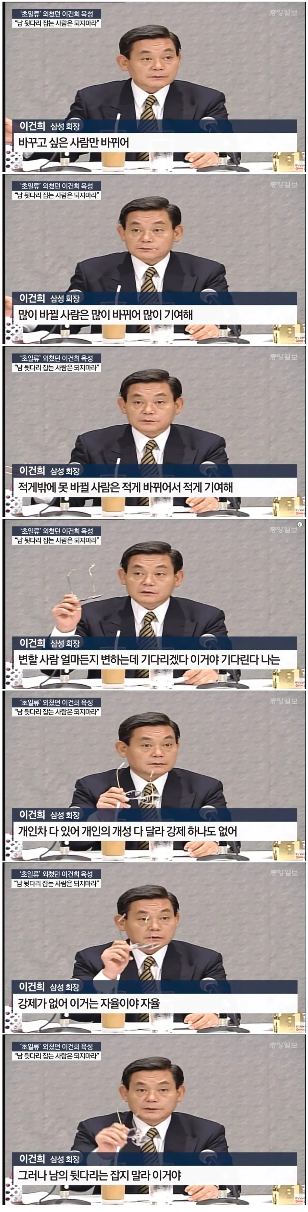 자신이 변할 수 있는 정도만큼 변화하면 된다는 거지. 많이 성장할 수 있는 사람은 더 크게 달라지고, 그에 맞게 더 많이 기여해야 해. 조금만 변화 가능한 사람도 자신의 한계 안에서 책임을 다하면 되고. 중요한 건 남의 발목을 잡으면서까지 자신의 이익을 챙기면 안 된다는 거야.
