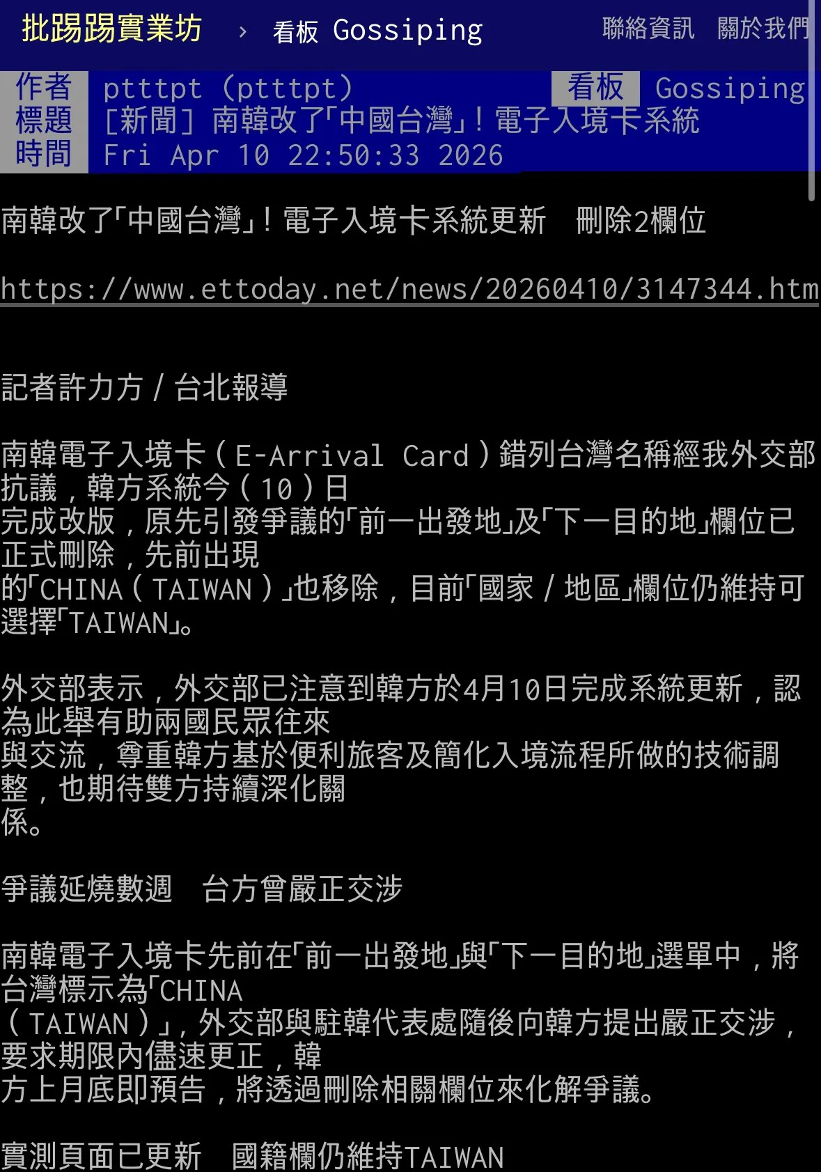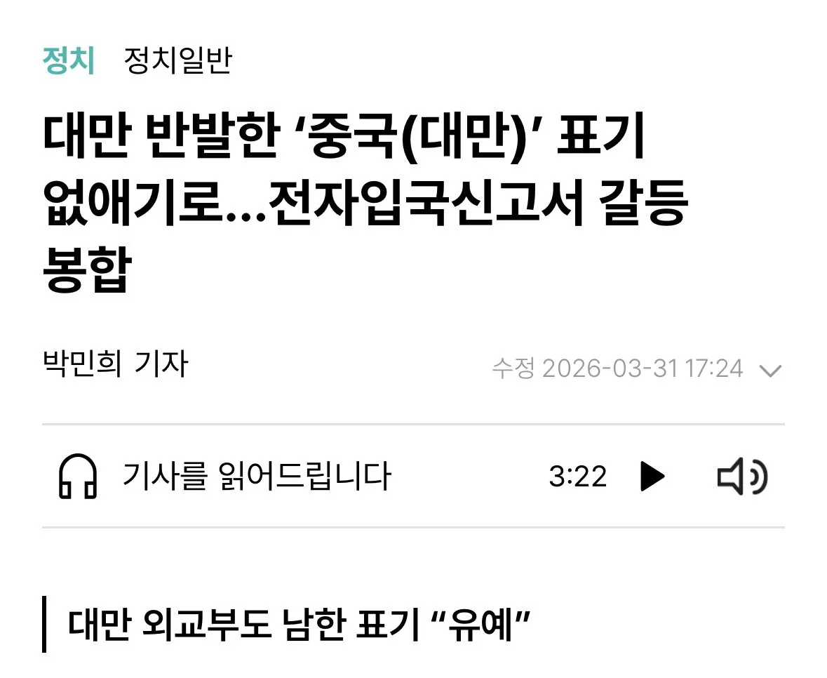 입국신고서 표기 건으로 한·대 간에 외교 분쟁이 발생했음. 실은 2004년부터 써온 표현이었지만 대만 정부(총통부·외교부·국회)가 집단으로 항의하면서 상황이 꼬임. 한국이 고치지 않으면 자기들도 한국을 '남한'으로 바꾸겠다며 맞대응을 예고했던 상황.