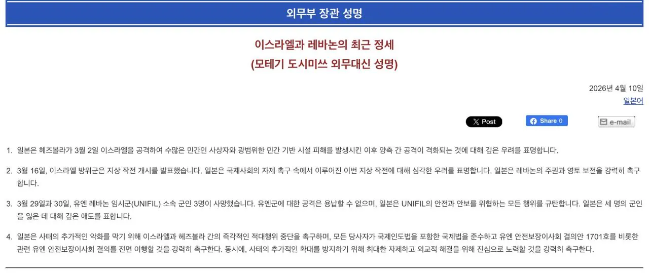 일본의 외무부가 입장을 밝혔다.이스라엘의 유엔 평화유지군 공격을 규탄하고, 레바논 공습에 대해 깊은 우려를 나타냈다.또한 레바논의 영토 주권 존중을 촉구하면서, 헤즈볼라와 이스라엘 모두에게 분쟁을 멈추고 평화적 해결을 찾을 것을 강하게 요구했다.