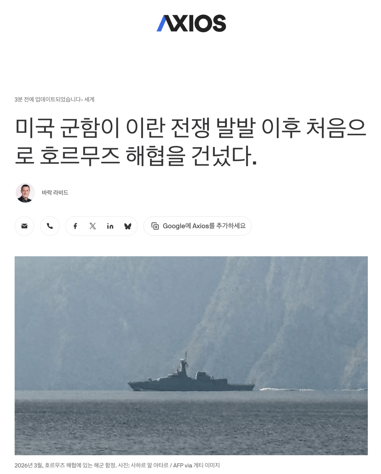 이어서 악시오스에서 미국 군함이 호르무즈 건넜다는 속보가 올라옴