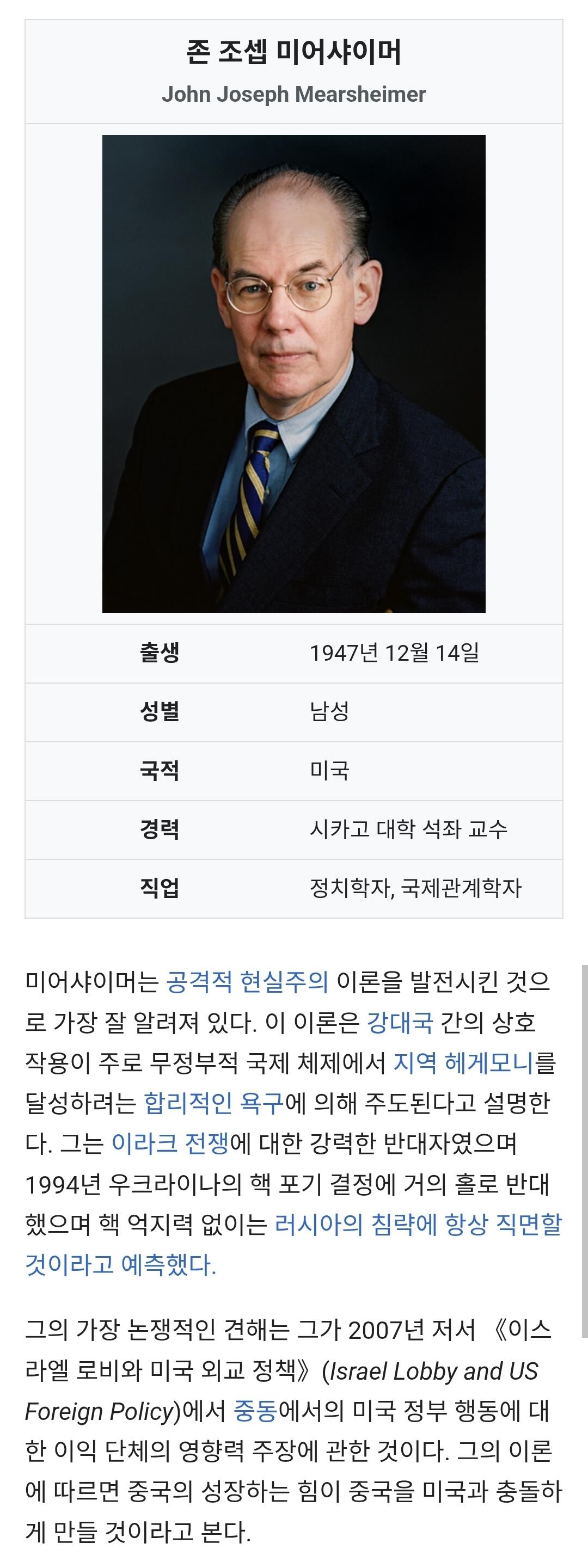 미어샤이머 교수는 국제정치학을 배우면 무조건 언급되는 세계적인 석학이라고함