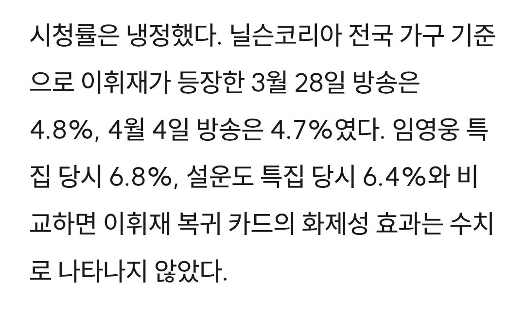 죄도 없는데 못 나올 이유가 뭐냐, 어차피 언급하는 게 화제성 아니냐는 댓글도 많았지만현실은 달랐다. 시청률도 떨어졌고 시청자 평가도 부정적으로 돌아섰다는 중론이다.