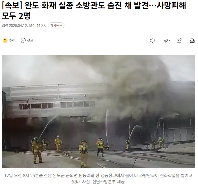 완도에서 발생한 화재 사건으로 실종되었던 소방관이 결국 숨진 채 발견되었다. 이로 인해 이번 사고의 전체 사망자 수는 2명이 되었다고 한다.