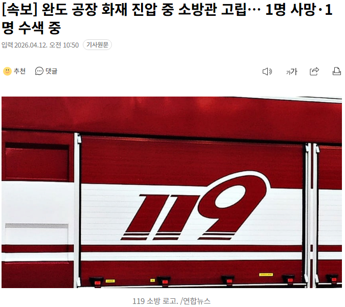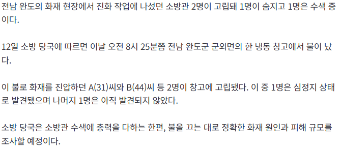 현장에서 소방관 고립 상황이 발생했고, 1명이 사망했으며 1명은 아직 수색 중이다.