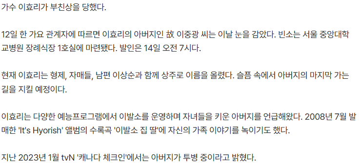가수 이효리가 부친상을 당했다. 남편 이상순이 상주 역할을 맡기로 했다고 전해진다.