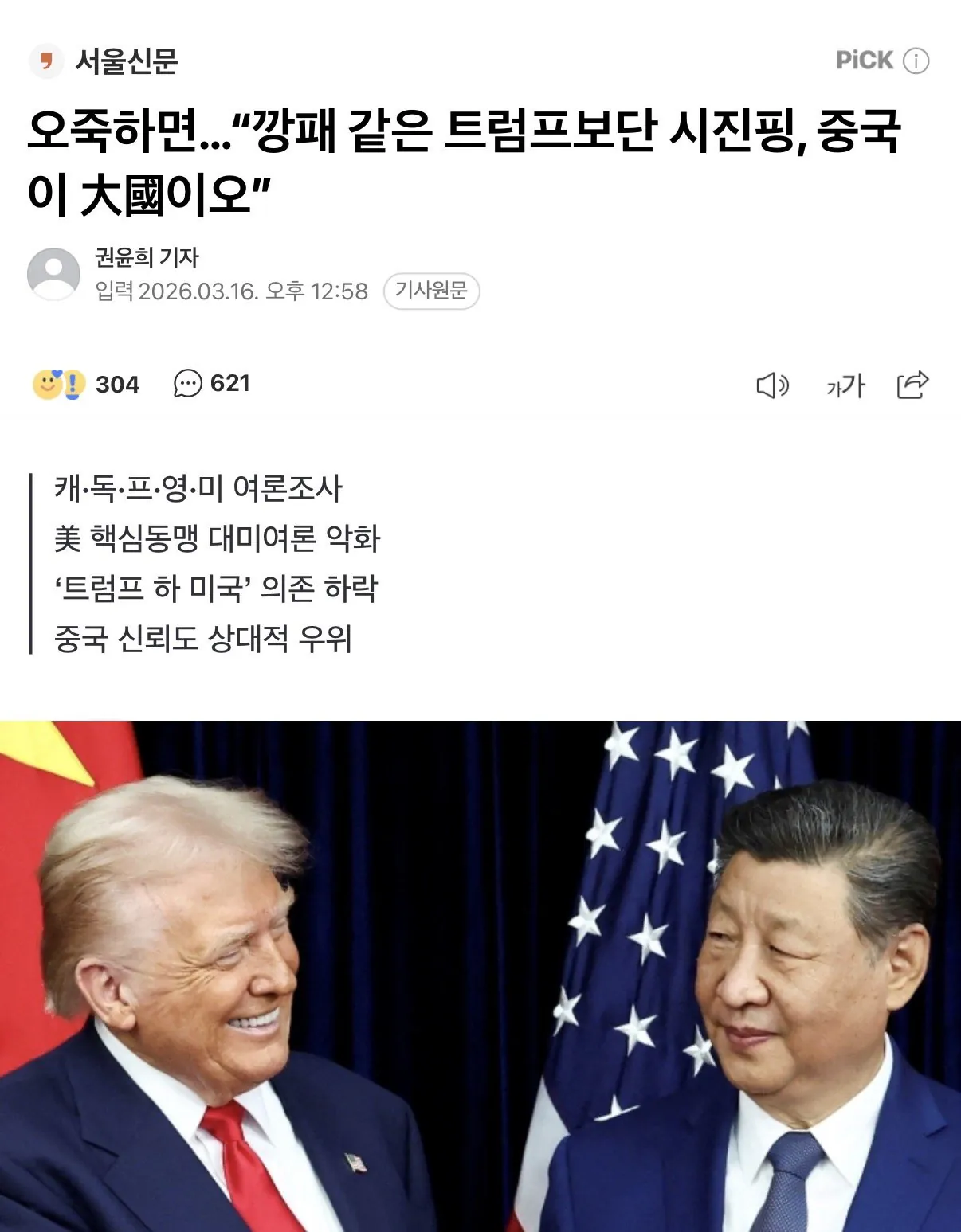 트럼프의 관세 정책으로 유럽과 캐나다가 크게 반발하자 여론조사에서는 중국을 더 신뢰하는 결과가 나올 지경까지 왔다