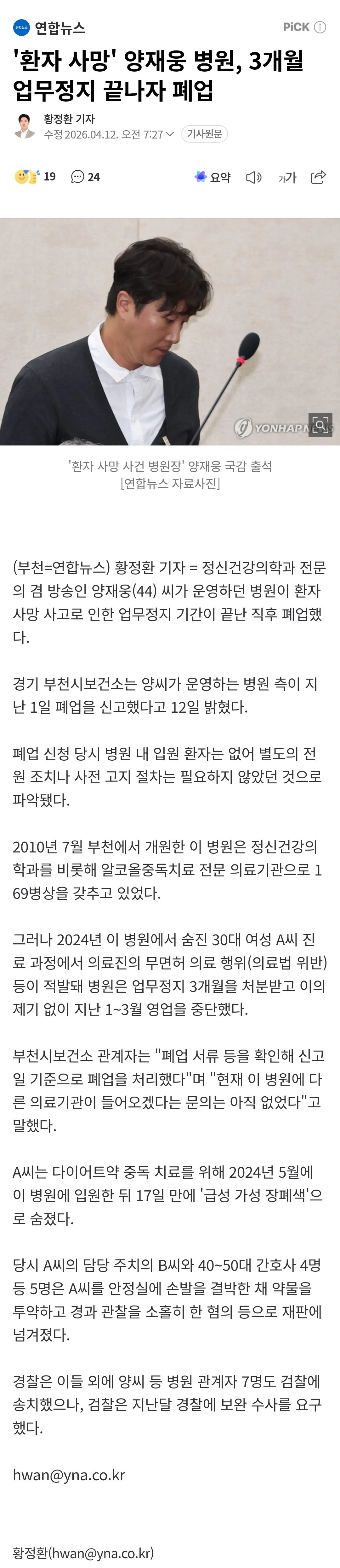 '환자 사망' 양재웅 병원, 3개월 업무정지 끝나자 폐업