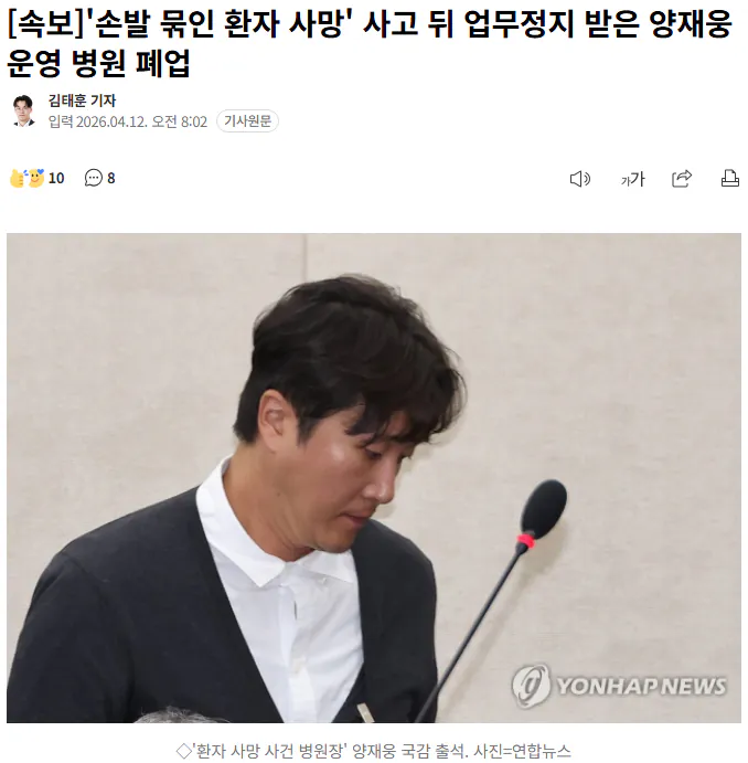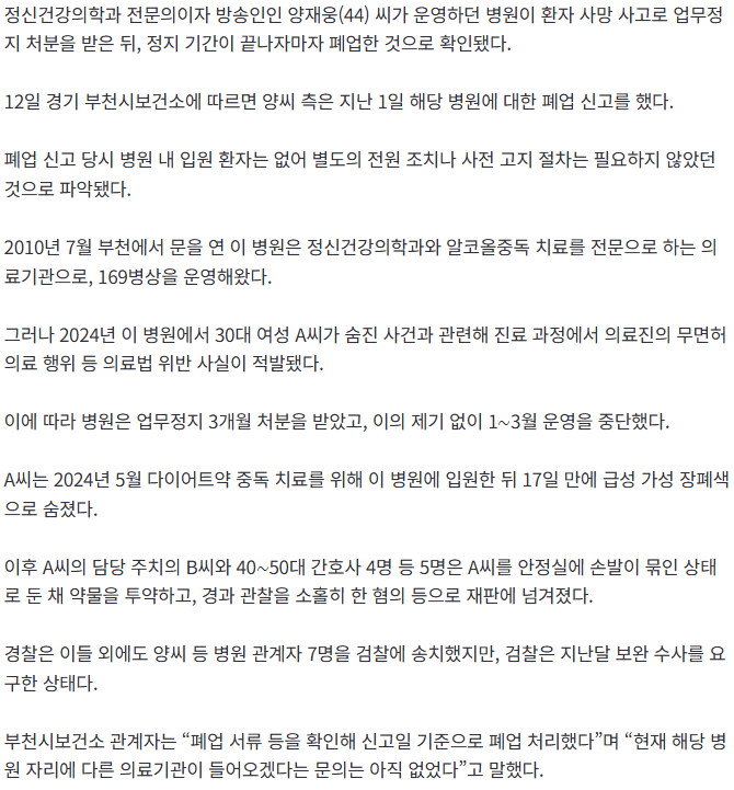 환자를 억제한 사건으로 업무정지 처분을 받은 양재웅 운영 병원이 결국 문을 닫기로 결정했다. 이 병원은 손발을 묶인 채로 사망한 환자 사건 이후 영업을 할 수 없게 되면서 폐업 수순을 밟게 된 것으로 보인다.