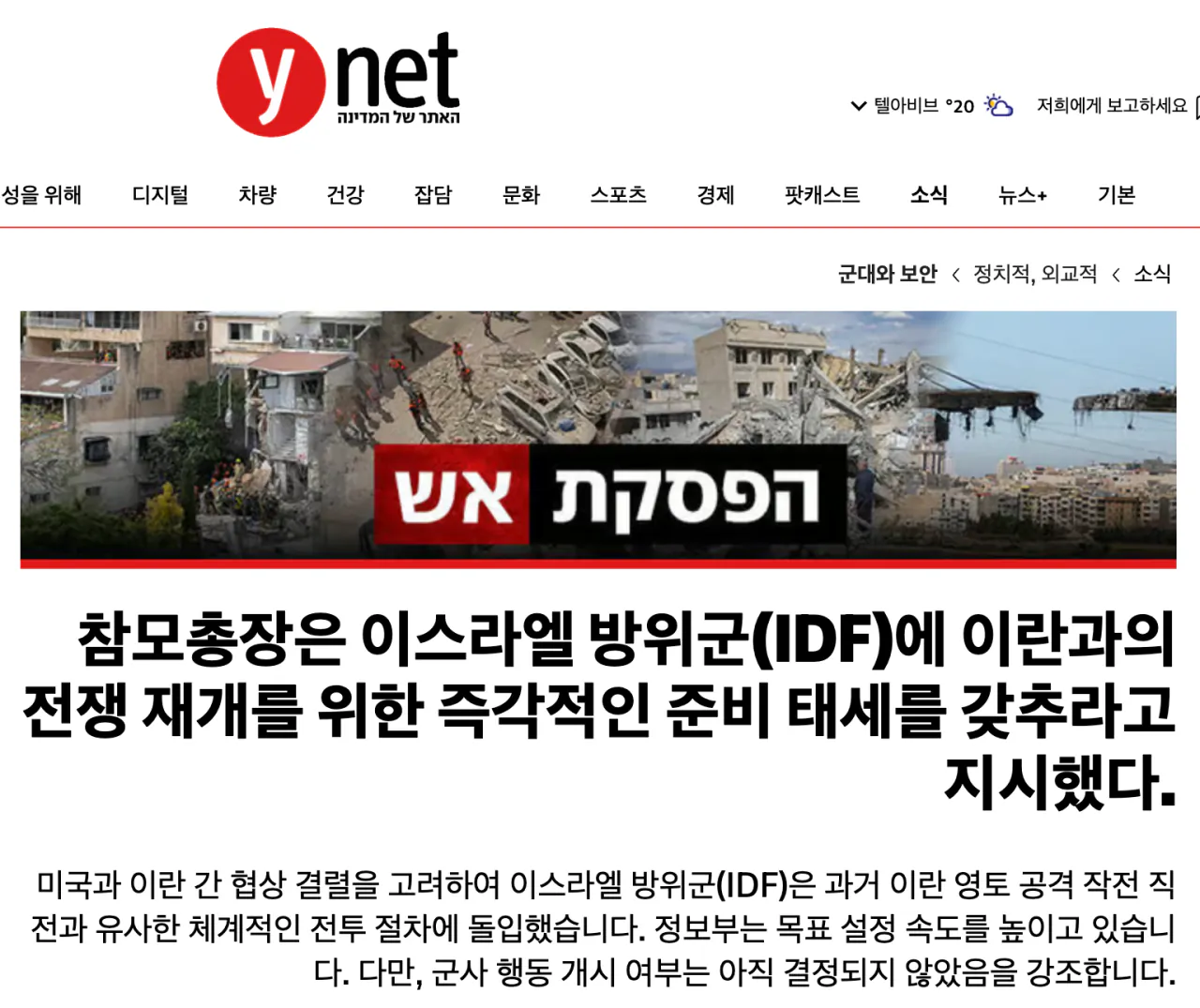 이스라엘 국방부가 이란과의 충돌에 대비한 긴급 명령을 내렸습니다. 합참의장 지시에 따라 모든 부대는 경계 수준을 한 단계 상향하고 빠른 시일 내 전투 개시에 대응하기로 했습니다. 파키스탄에서 진행되던 미국-이란 협상이 결렬된 이후의 결정입니다.