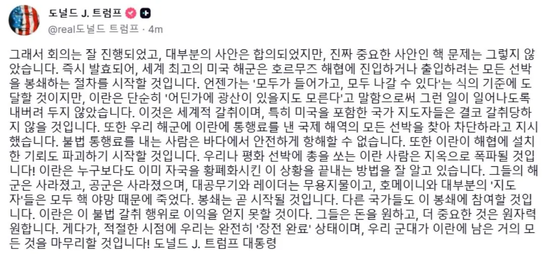 속보) 트럼프: 미해군으로 호르무즈 해협 봉쇄...