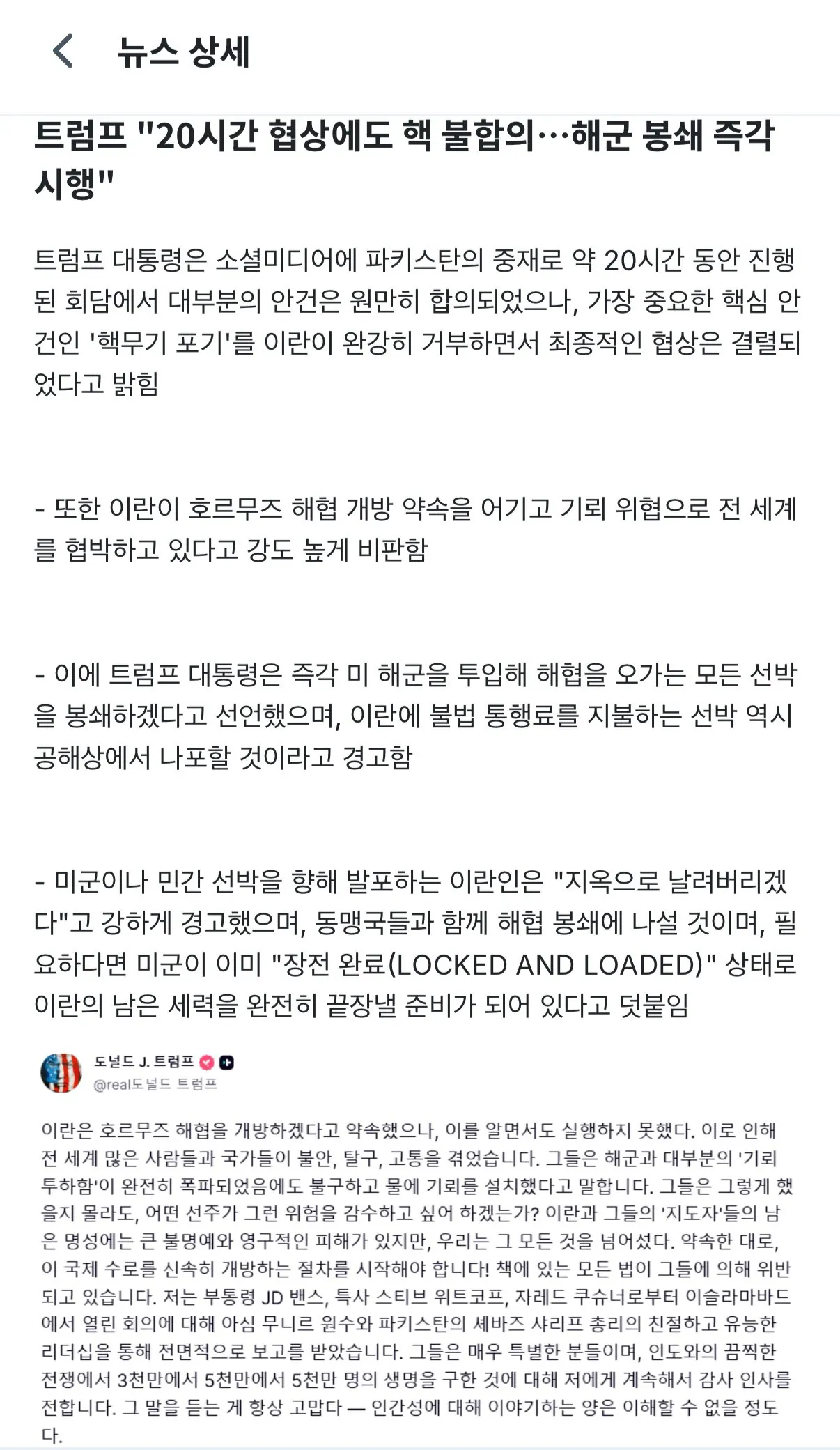 속보) 트럼프: 미해군으로 호르무즈 해협 봉쇄...