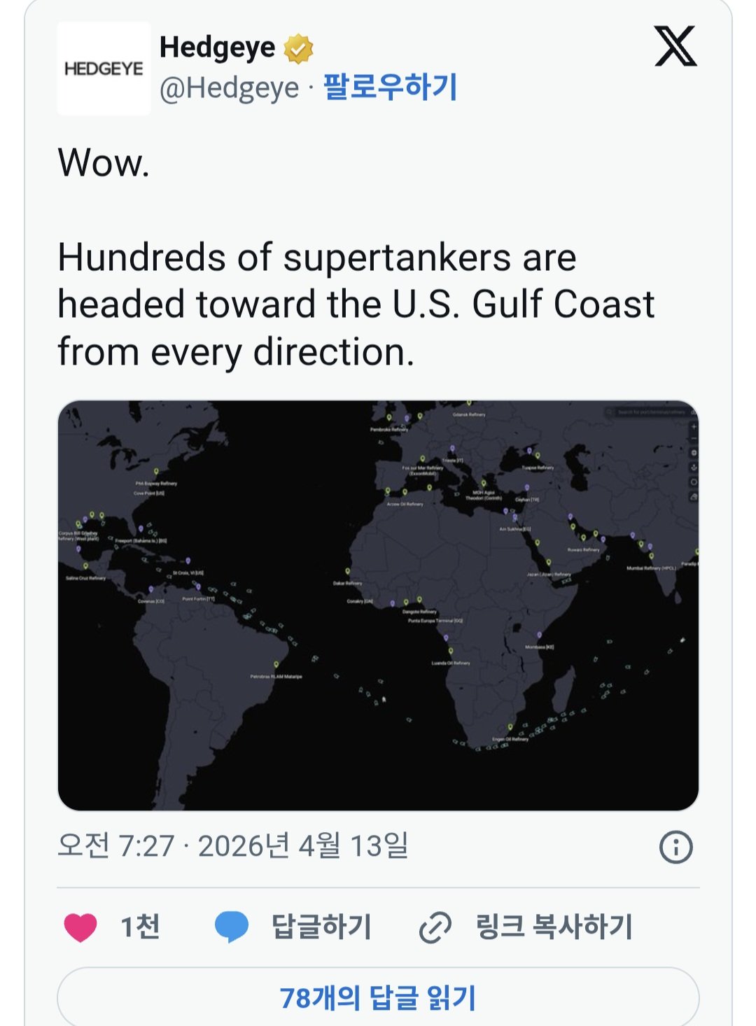 지금 전세계 각국의 정유사들이미국산 석유 구입 계약을 서두르면서호르무즈행 유조선들이 미국행으로 경로 변경ㄷㄷ이로써 모두가 불편해할 진실을 말하자면세계 경제 최후의 희망은 미국산 석유와최근 미국이 장악한 베네수엘라 석유임