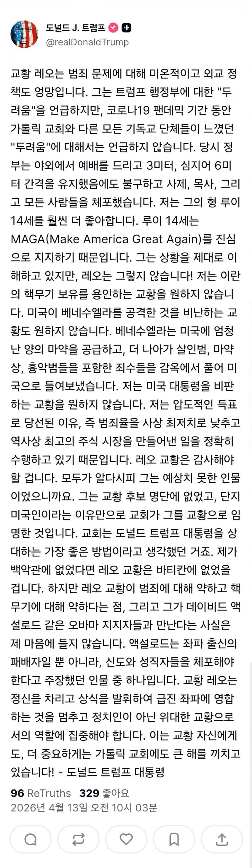 https://truthsocial.com/@realDonaldTrump/posts/116394704213456431요약) 교황은 정치적으로 편향된 급진 좌파새끼고 사실 자격도 없는 인간인데 나 덕분에 미국인이란 이유로 교황 된 주제에 비판 그만하고 복종해라