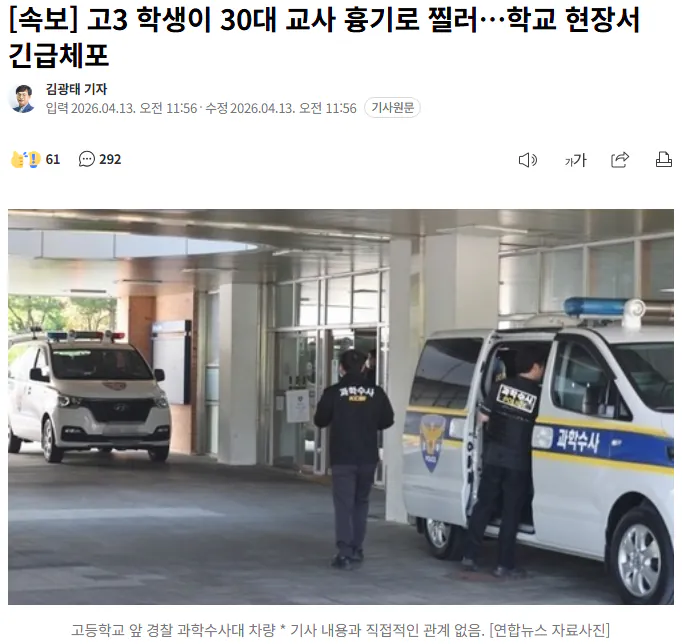 학교 현장에서 충격적인 사건이 발생했다. 고등학교 3학년 학생이 30대 교사를 흉기로 공격하는 일이 벌어졌고, 학생은 즉시 경찰에 체포됐다.