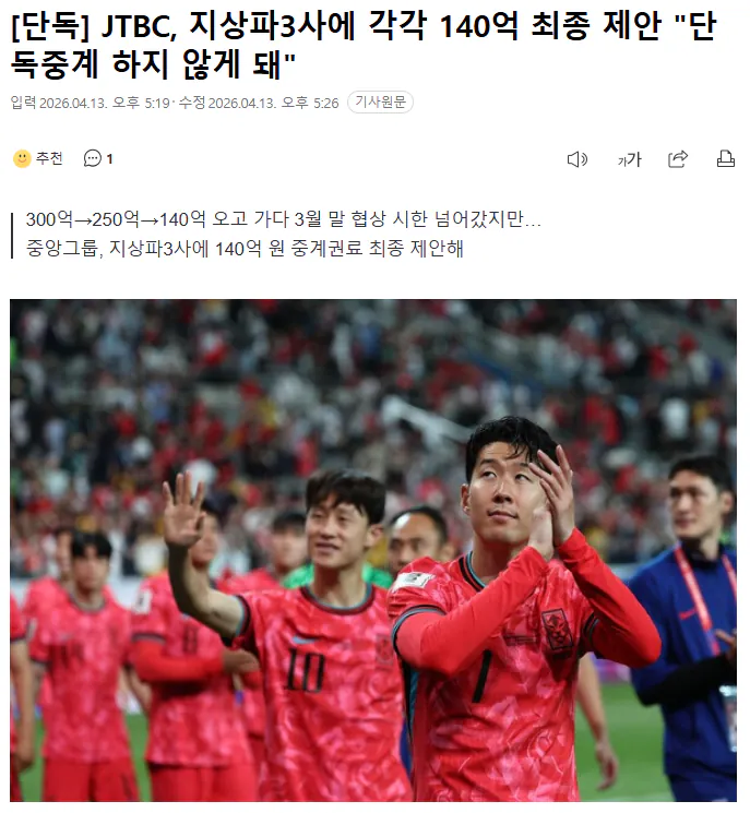 2026년 북중미 월드컵 중계권 협상이 마무리됐다. JTBC의 독점 중계 계획이 무산되고, 지상파방송(KBS·MBC·SBS)과 함께 중계하기로 결정된 것이다. 각 지상파에 140억 원씩의 중계권료를 제시하기로 합의했다.중앙홀딩스는 "JTBC가 지상파의 제안을 수용했으며 더 이상 JTBC 독점 중계는 없을 것"이라고 발표했다. 다만 각 방송사의 입장 차이로 최종 중계 참여 방송사 수는 추후 결정될 예정이다.