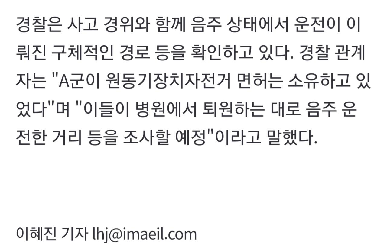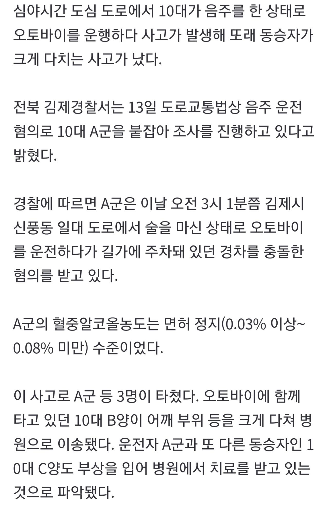 음주한 10대 청소년이 오토바이를 조종하다가 여학생 2명을 태운 상태에서 교통사고가 발생했다. 사고로 인해 탑승자 중 1명이 중상을 입었으며, 경찰이 사건을 조사 중인 것으로 전해졌다.