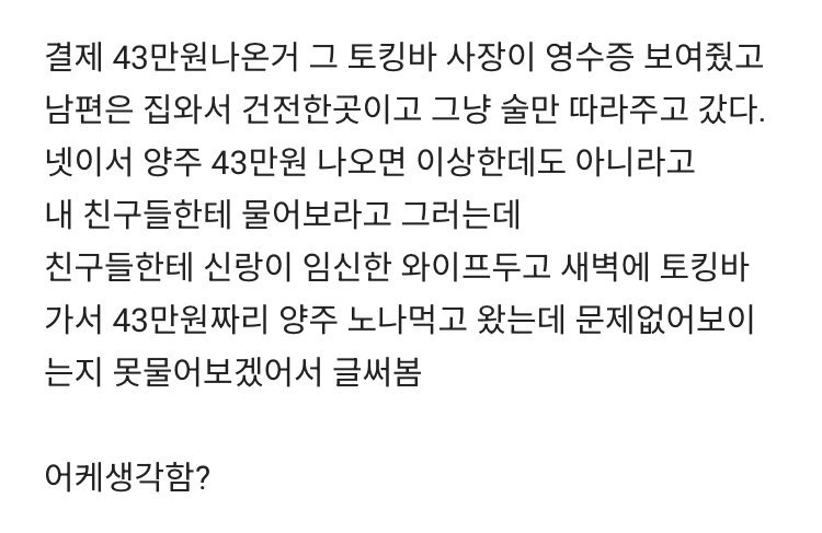 남편이 남자 친구 3명이랑 토킹바를 다녀왔는데, 4명이서 총 43만원이 나왔대요남편은 인당 비용이 괜찮다고 생각하는데, 아내는 이 금액이 좀 많은 것 같다고 생각해요의견 차이가 생겨서 부부가 싸우는 중이라고 합니다
