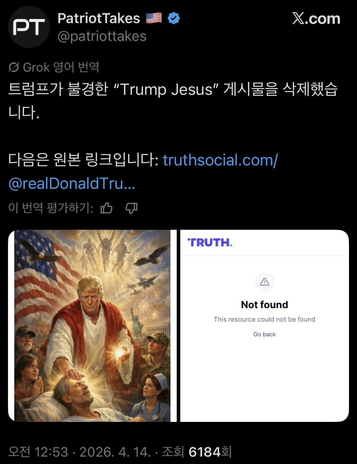 하지만 트럼프가 자신의 모습을 예수님처럼 표현한 이미지를 올렸다. 평소에 그렇게 도덕과 신앙을 앞세우던 지지자들도 이건 신성을 모독하는 행동이라며 비판에 나섰다. 결국 논란이 커지자 해당 게시물은 결국 삭제되었다.
