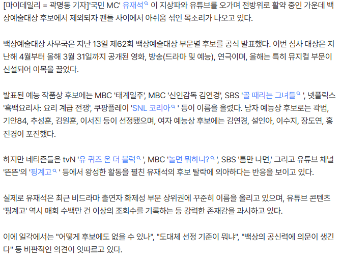 "유재석 패싱 논란"…백상 후보 제외에 "핑계...