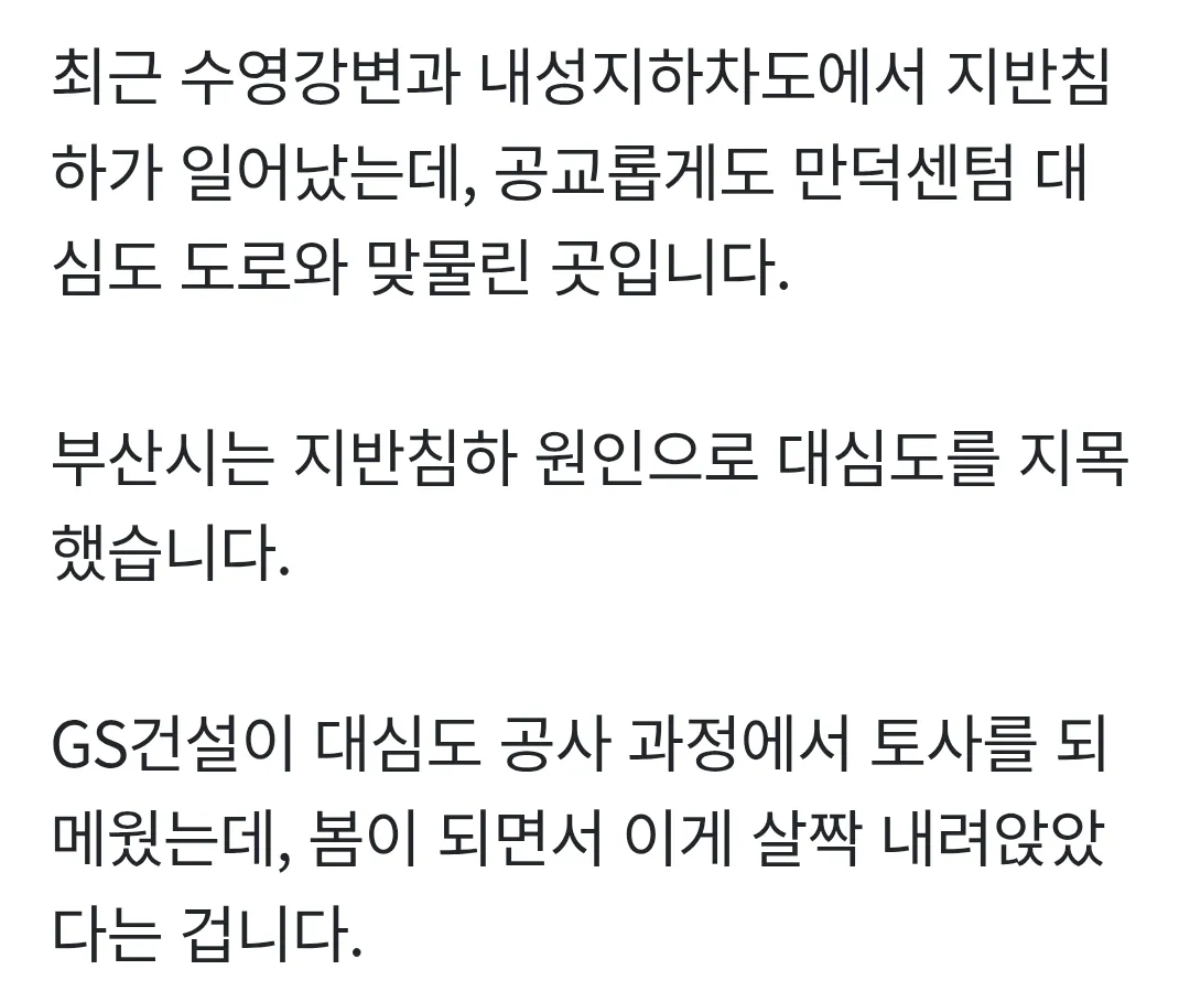 GS건설이 맡은 부산 대심도 터널 공사에서 부실 시공 의혹이 계속 터져 나오는 중이야.공사 품질 문제로 논란이 커지는데, 부산시는 이를 감싸려다 거짓 발표가 들통 났대.정부-건설사-지자체가 다 얽혀 있는 상황이네.