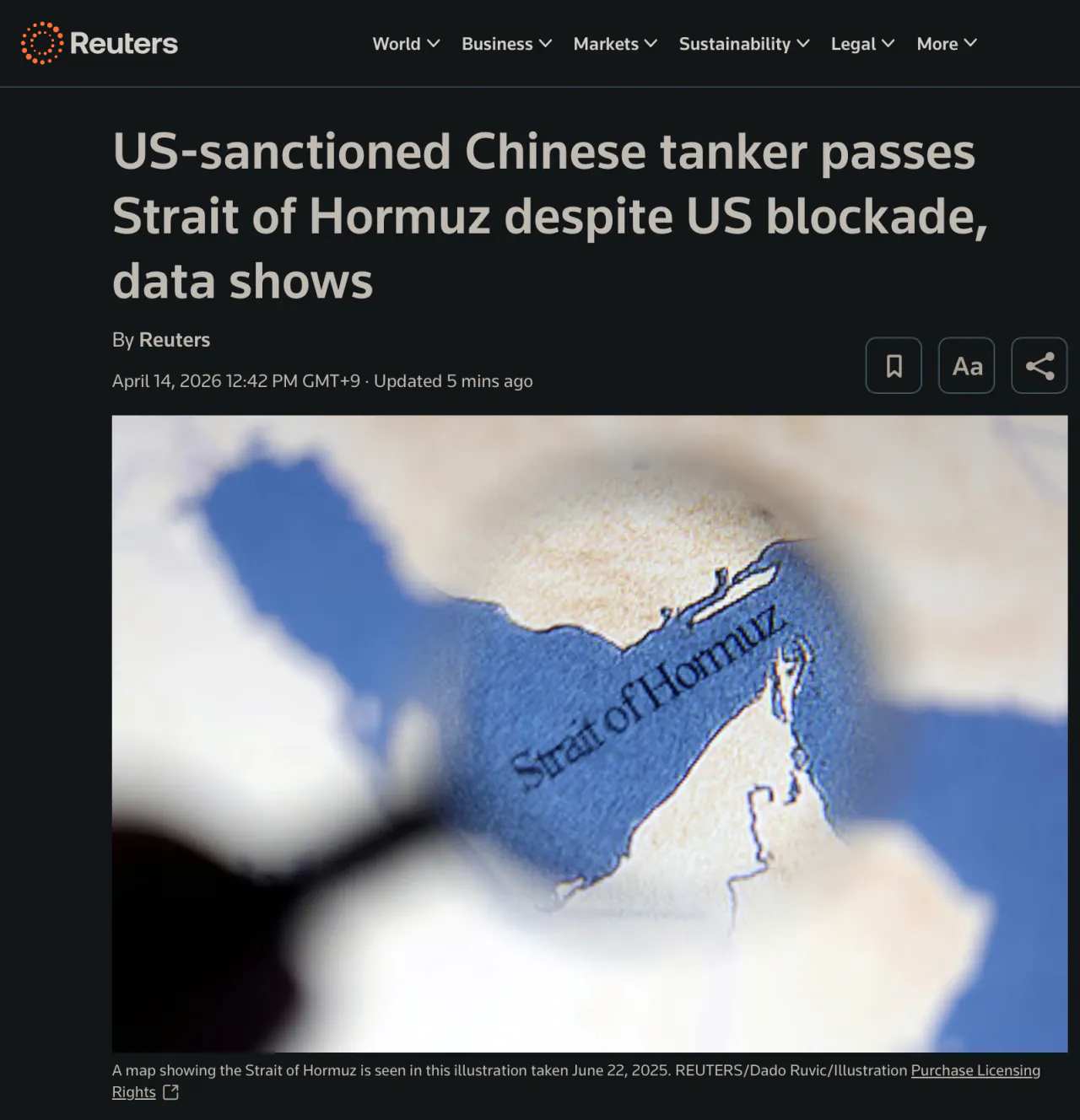 미국 제재 대상 중국 유조선이 호르무즈 해협을 통과한 사실이 포착됐다. 마린트래픽, LSEG, 케플러 등 해운 추적 기업들의 데이터 분석에 따르면 리치 스태리호가 미군의 해상 봉쇄를 뚫고 걸프만에서 탈출한 첫 번째 사례인 것으로 확인된 것이다.이 유조선의 소유사인 상하이 쉬안룬 해운은 이란과의 불법 거래 혐의로 현재 미국의 경제 제재를 받는 중이다.