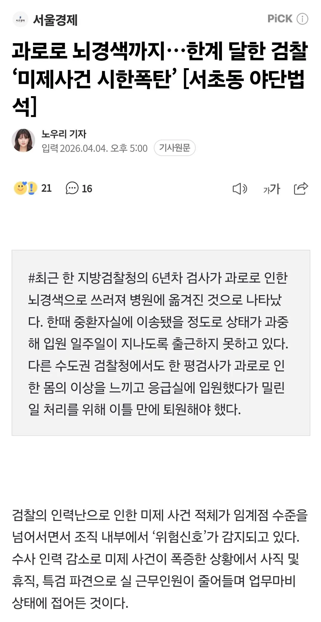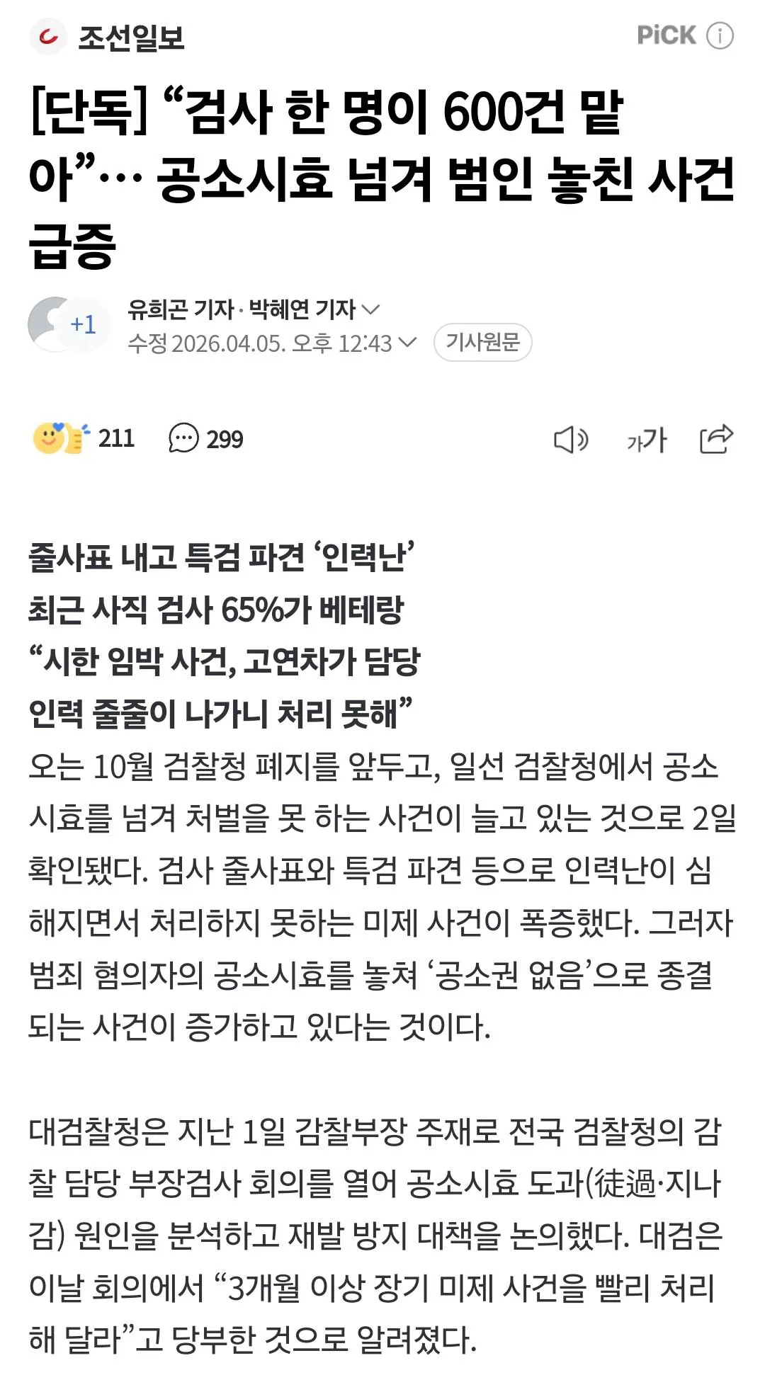 인력이 모자라니까 미제사건들이 계속 쌓여가고 있는데, 검사들이 과로 때문에 뇌경색으로 쓰러지는 일까지 벌어지고 있다고 함