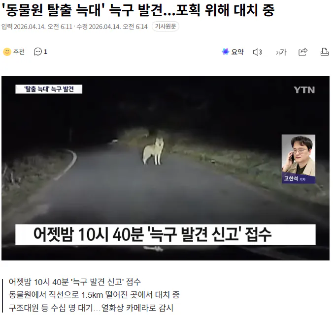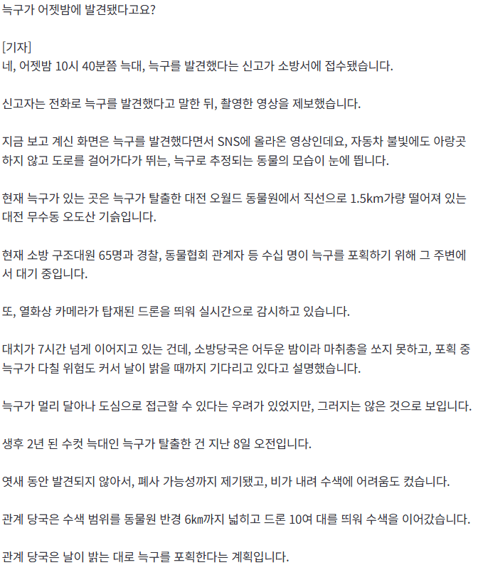 동물원을 탈출했던 늑대 늑구가 발견되었습니다. 현재 포획을 위한 대치 상황이 진행 중입니다.