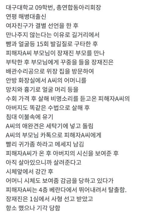 4층에서 떨어진 피해자의 팔을 질질 끌고 다시 올라가는 짓을 하고 있다더라. 정말 인간 이하의 행동. 더 악질인 건 피해자를 죽이지 않은 이유 - 부모 시신을 직접 보게 해서 평생을 트라우마로 살아가라는 의도라고 함. 완전히 악마 같은 새끼다교도소의 기강이 완전히 붕괴되었다