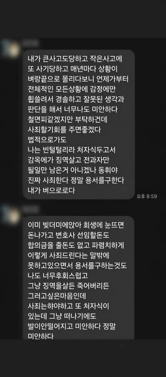 제 친한 동생이 중국집에서 일하다가 칼에 찔렸습니다.손바닥이 관통되어 응급실에 갈 정도로 끔찍한 일을 겪었는데, 중요한 건 이게 끝이 아니라는 겁니다.동생은 무려 5년 동안 그곳에서 노예처럼 착취당하고 구타당했습니다.가해자는 동갑내기 중국집 사장이었고, 사장은 툭하면 고무망치, 쇠망치, 쇠줄로 무자비하게 폭행했습니다.하루에도 몇 번씩 목을 졸라 기절시키기도 했습니다.동생은 기절해서 의식을 잃는 그 짧은 순간이 유일하게 고통을 잊을 수 있는 시간이어서 가장 행복했다고 말했습니다.더 충격적인 건, 집주소와 어머니 성함, 연락처까지 모두 알고 있어서 도망치면 가족들을 다 죽여버리겠다고 협박했다는 점입니다.동생은 혹시라도 본인 때문에 가족에게 큰일이 생길까 봐, 그 공포 속에서 도망칠 엄두조차 내지 못했습니다.퇴직금도 필요 없고, 오히려 자신의 전 재산을 다 줄 테니 제발 그만두게 해달라고 울며 사정했지만 사장의 가혹행위는 오히려 더 심해졌습니다.동생 어머니께 장사도 안 되는 가게를 인수하라며 돈을 받아오도록 대본까지 써주고, 제대로 외우지 못하면 또 폭행을 가했습니다.폭행으로 머리에서 피가 나 미용실에도 못 가자, 사장이 직접 바리캉으로 머리를 밀어버렸고 다리가 부어 걷지 못할 때는 2층 다락방에 가둬 놓고 요강 같은 통에 대소변을 보게 했습니다.하루 한 끼도 제대로 못 먹고 수돗물로 버티다가 결국 영양실조에 무릎 수술까지 받아야 하는 상태가 되었습니다.정말 소름 돋는 건, 탈출한 동생이 경찰에 신고하자 그 인간은 경찰에게 서로 싸운 것뿐이라고 뻔뻔하게 거짓말을 했고,이제는 돈이 없다며 처자식 핑계를 대며 선처를 구하는 카톡까지 보냈다는 겁니다.지금 시대에 영양실조가 말이 됩니까?평범했던 제 동생의 몸과 마음을 갈기갈기 찢어놓은 이 악질적인 가해자가 법의 심판을 피하지 못하도록 제발 이 내용을 널리 알려주세요.(사진 : 이제와서 선처구한다는 가해자의 카톡내용)