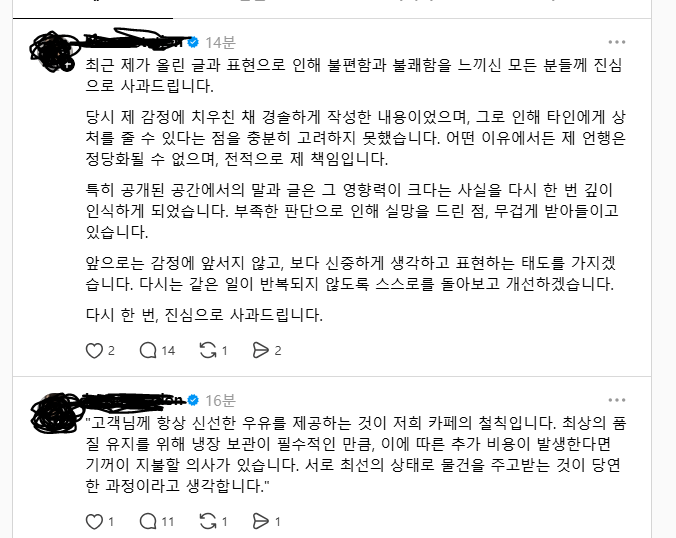 욕먹고 사과문 올라옴ㄷㄷㄷ