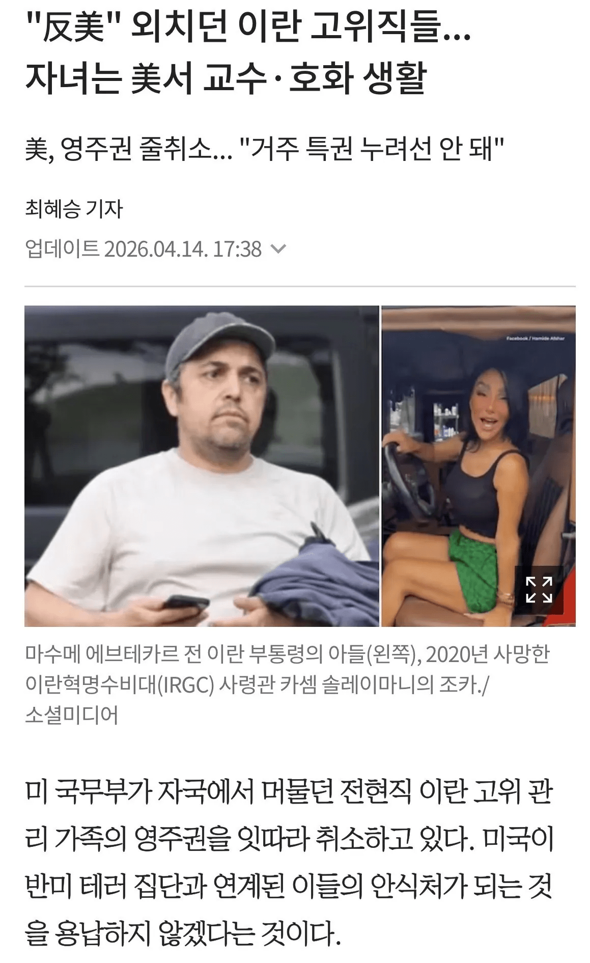 "반미" 외치던 이란 고위직들... 자녀는 美서 교수·호화 생활 ㄷㄷㄷㄷㄷㄷㄷ