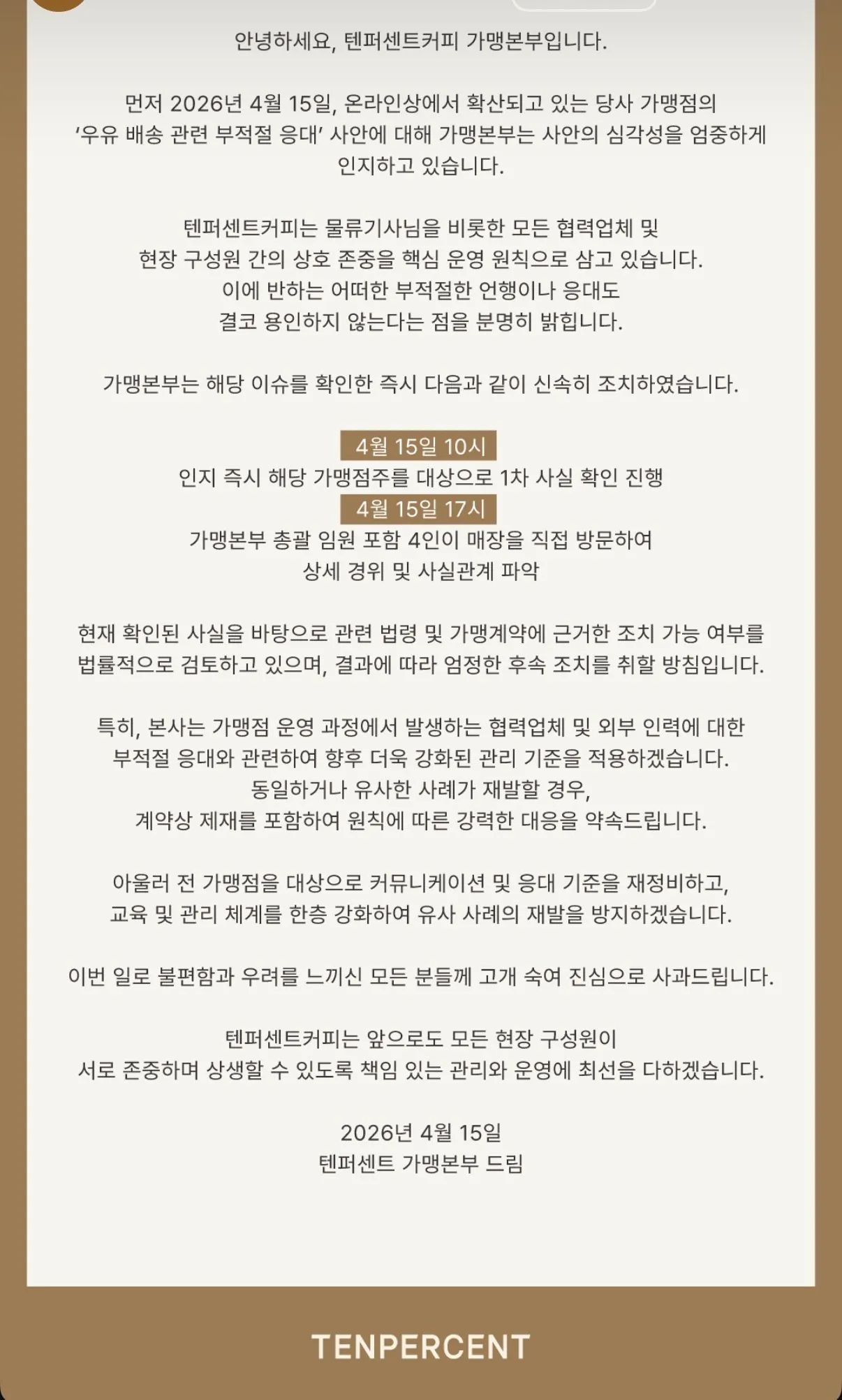 본사 임원들이 오늘 오후 5시쯤 직접 찾아온 뒤상황이 얼마나 심각한지 깨달았고손해배상청구나 계약 해지를 걱정한 것으로 보여직접 손으로 쓴 사과문을 공개했다한편 텐퍼센트 측은법적 검토를 진행 중이며이후 적절한 대응을 나설 전망이다