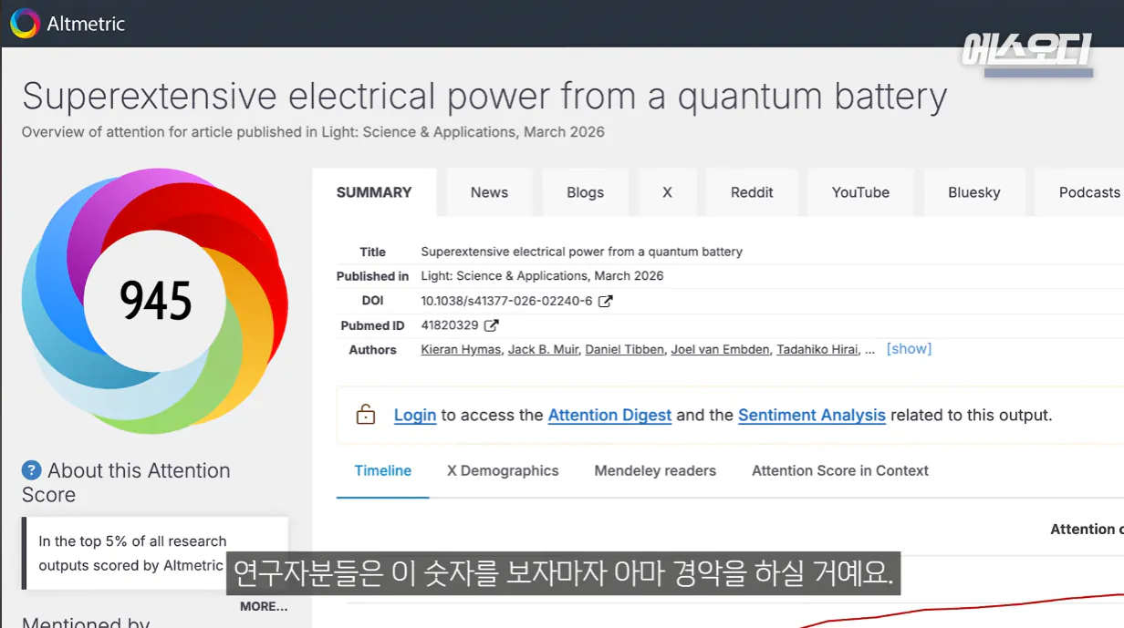 햇빛 같은 일반 빛으로도 충전 가능하다는 게 핵심이네지금까지는 이론에 불과했던 양자 배터리를 실제로 만들고 논문과 실험으로 검증했대물리법칙이 깨진 건 아니고, 기존에 낭비되던 에너지를 효율적으로 모아서 손실을 극소화한 거라고날고 있는 드론에도 레이저를 쏴서 무선 충전이 가능하다고 해배터리 무게에서 자유로워진 전기차가 하늘을 날 수 있는 미래도 가능해지는 거네인류의 발전도 이 속도라면 정말 빨라질 것 같은데