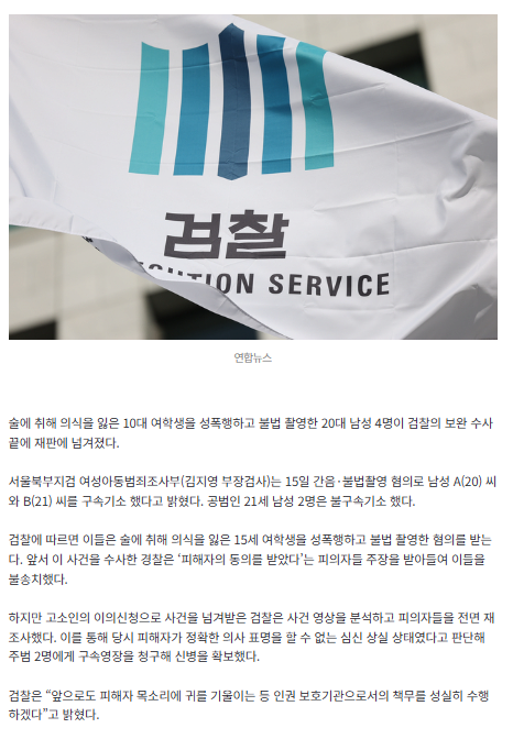 [충격]만취 15세 집단 성폭행에 불법 촬영까지 한 20대 남성 4명, 경찰 ‘불송치’…결국 검찰이 기소