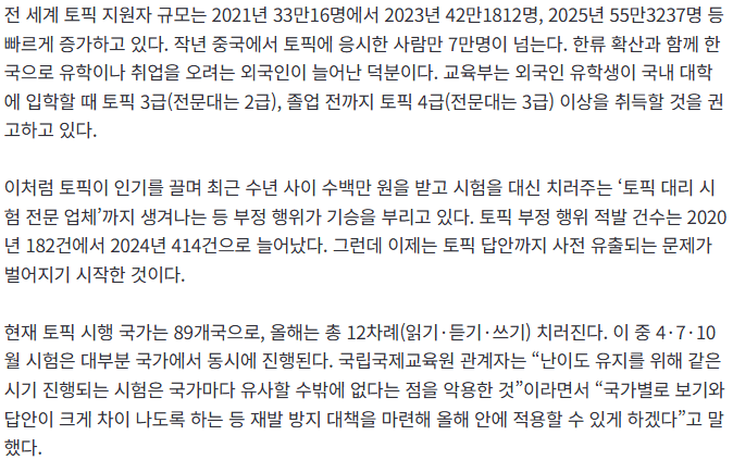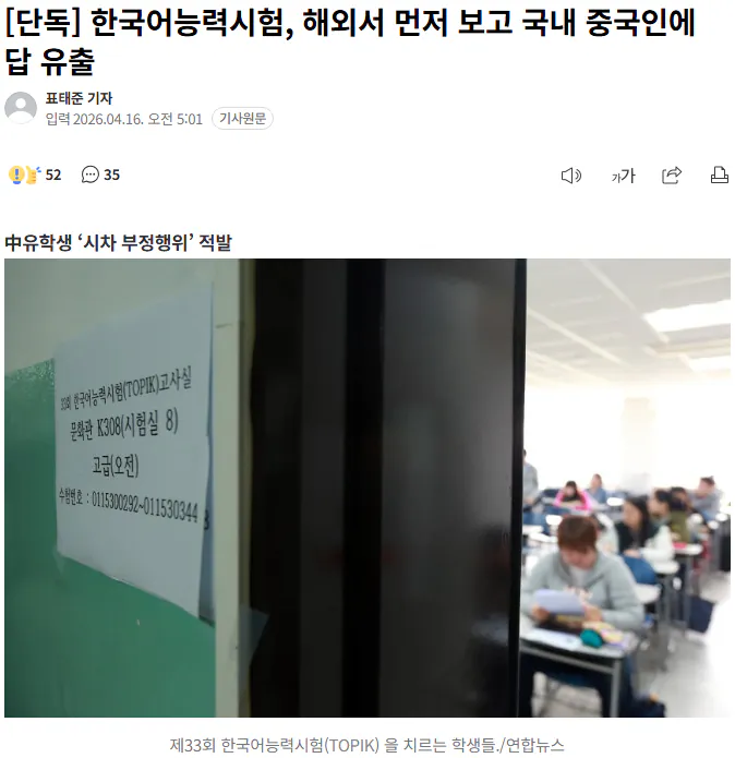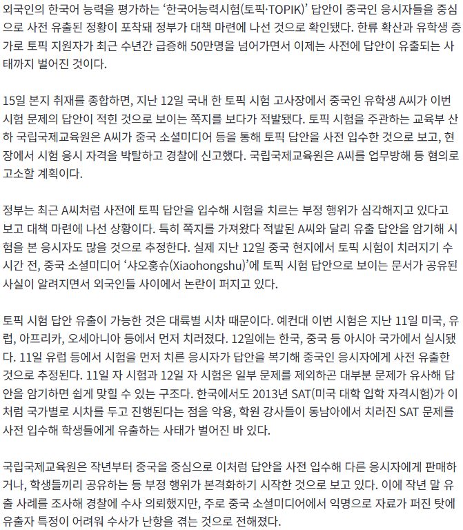 한국어능력시험에서 또 부정행위 논란이 터졌다. 해외 시험장에서 먼저 시험을 본 사람들이 국내의 응시자들한테 답을 흘려준 것 같다. 특히 중국 내 응시자들이 이렇게 나돌아다니는 답을 받아서 시험을 봤다고 하니, 시험의 공정성 문제가 이제 심각한 지경에 이르렀다.