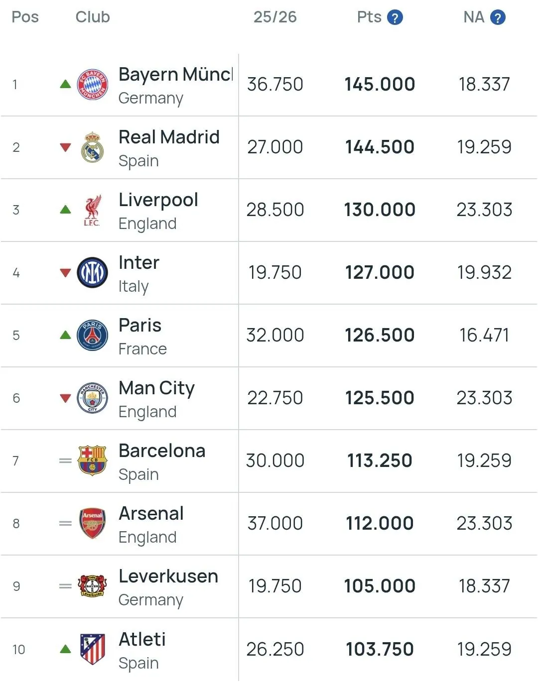 바이에른 뮌헨이 UEFA 클럽 1위 올랐대