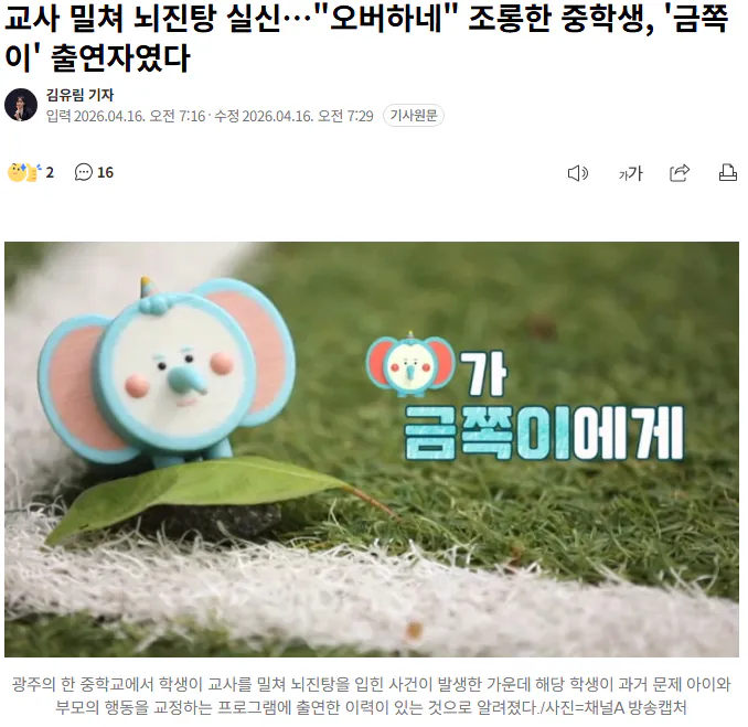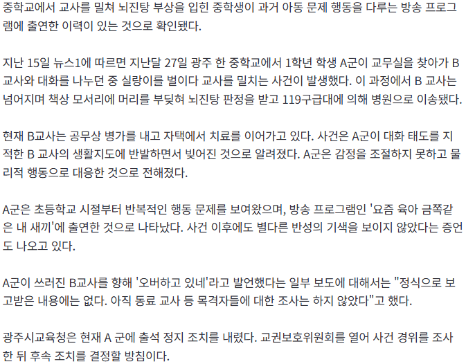 한 중학생이 교사를 밀쳐 뇌진탕과 실신을 입혔던 사건이 주목받고 있다. 더 논란이 되는 부분은 학생이 쓰러진 교사를 향해 "오버하는 거 아닌가" 라며 비아냥댔다는 점. 알고 보니 이 학생은 인기 예능 프로그램 '금쪽이'에 출연한 인물이었던 것으로 확인됐다.
